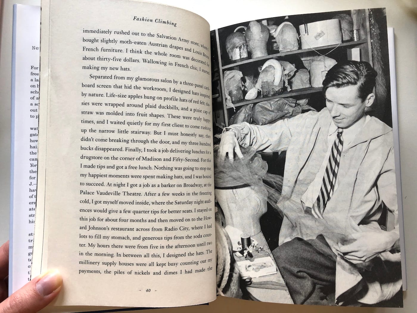 The seeds of his ethnographic proclivities were planted early. Fashion Climbing proceeds to not only detail his early career as a milliner, but catalogue all of the parties he crashed in mid-century Manhattan. There are interesting anecdotes — like how when he was stationed in France during the Korean War he’d affix flowers to his helmet and stash fashion magazines in his locker — but the book only barely reaches the time he started in fashion journalism at Women’s Wear Daily, and doesn’t relay his interest in photography at all. It’s almost like we’re reading the memoir of an entirely different person.