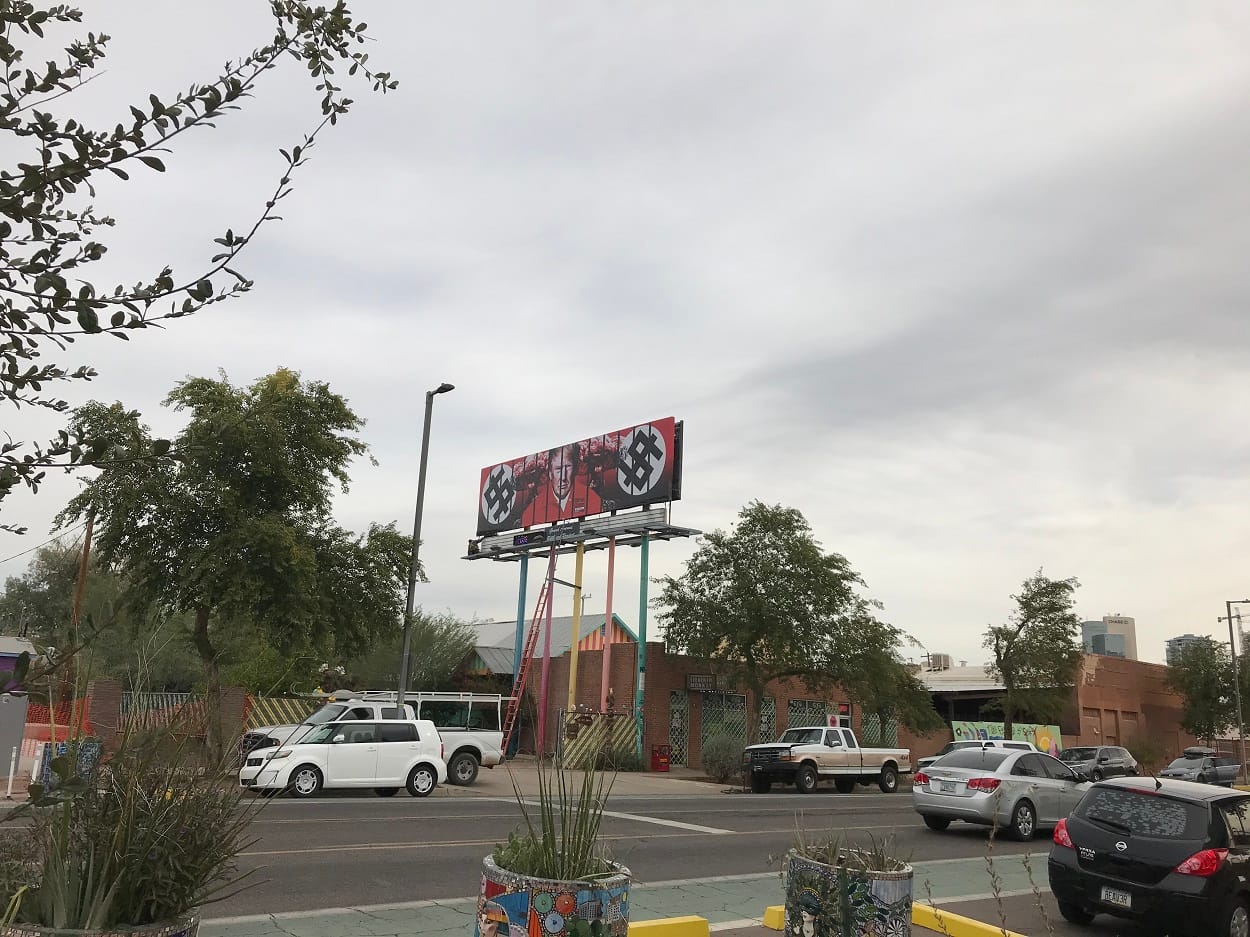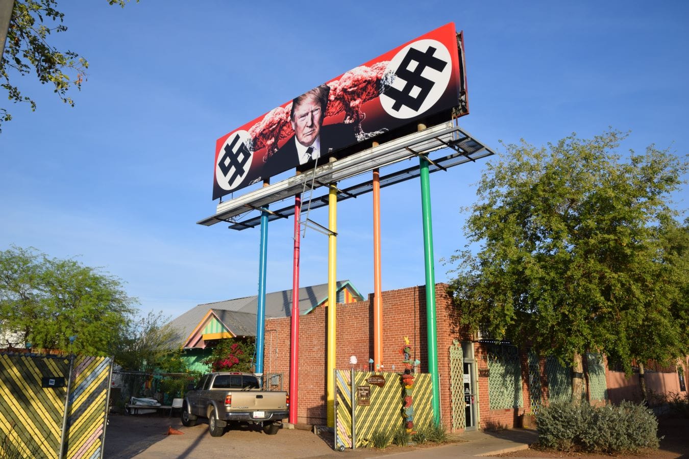 The billboard is owned by Phoenix artist Beatrice Moore, who first installed one of Fiorito’s designs in 2004. At the time, Fiorito chose George W. Bush's declaration of war in Afghanistan as her subject matter. More recently, she’s concentrated her efforts on Donald Trump, using imagery including dollar signs resembling swastikas and Trump wearing an orange jumpsuit behind prison bars. Fiorito says her first Trump design led to death threats, adding that the current imagery hasn’t garnered much controversy. “I got a little blowback on social media right after it went up, but people always make snarky comments,” Fiorito explained.