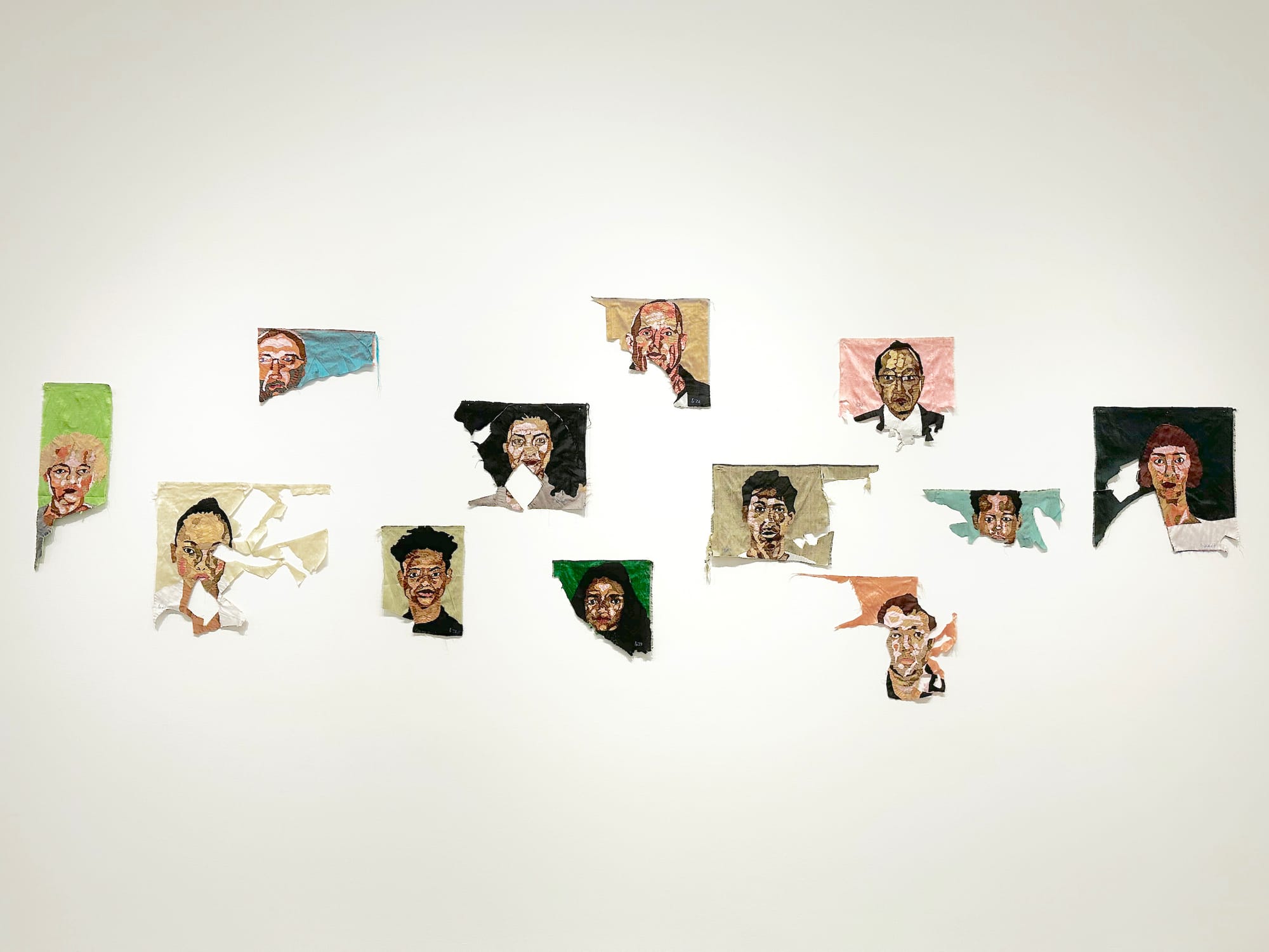 A notable departure from the larger scenes is a series of 12 portraits that sit opposite a wall of irregularly shaped and antiqued beveled mirrors, creating a play of seeing oneself against the tapestry of faces as you try to engage both works at once. Together, they constitute the titular work. The faces depict those emotionally closest to the artist. “It’s my wish for the world,” Zangewa said of the title, “where we all live in harmony as one community, instead of all the things that we do to one another because of cultural difference.”