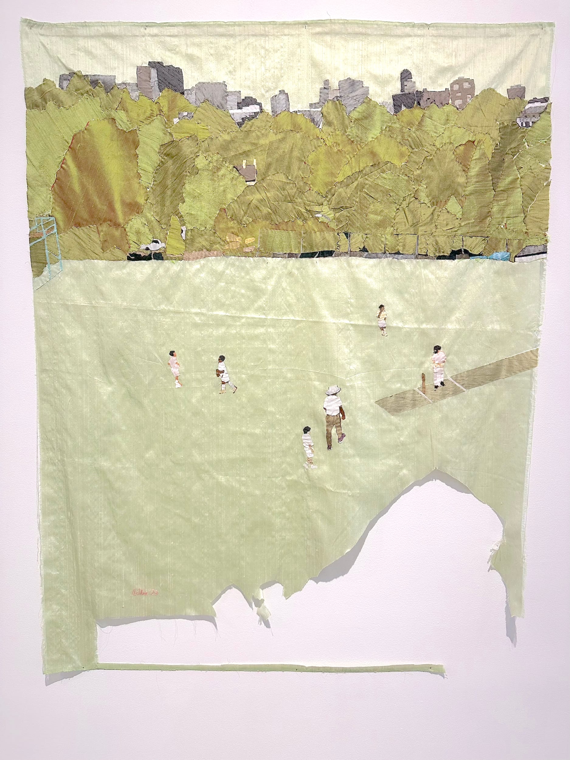 Field of Dreams, her latest exhibition, currently on view at SITE Santa Fe, pulses with themes of chosen family, love for one’s child, and reflections on the many selves that we have inhabited. The gallery space consists of mostly large, intricately hand-stitched collages hanging freely on the walls, which viewers can inspect closely enough to see the fabric move in response to their breath. Unique to Zangewa’s work is her tendency to cut out swaths of fabric from compositions, often echoing the negative space in other pieces on display from which one piece was cut to create another.