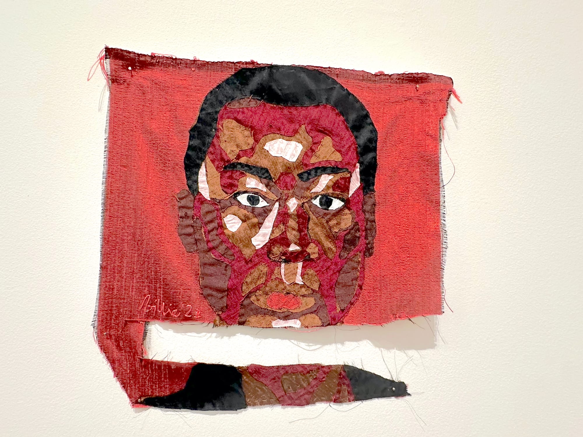 Can textile art transcend two dimensions? Zangewa’s collages incorporate frayed cut-out shapes, values layered atop one another that create movement and dimensionality, all hand stitched together. Noticing a pin that’s been left in a cut-out shape in “Under African Skies,” I think of how, like Zangewa’s Field of Dreams, the tableaus of our lives are stitched together with intention and memory.