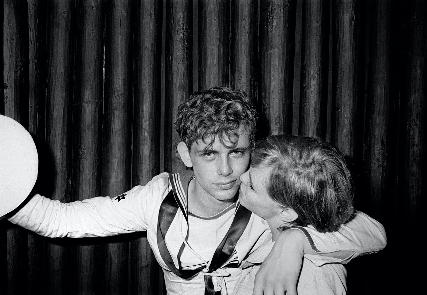 Now, Billy Monk: Defiance and Decadence Under Apartheid, an exhibition of 20 gelatin silver prints made from Monk’s original black-and-white negatives, which is on view at The Container, in Tokyo’s Nakameguro district, offers compelling evidence that Monk’s flash-lit snaps of sailors, prostitutes, transvestites, dock workers, musicians, and young people out for booze-filled, lust-driven nights on the town, which he shot on fine-grain film with a standard, 35mm lens, have begun to earn a place alongside the iconic images of eccentrics and demimonde figures of such noted modern photographers as Brassaï, Frank Horvat, Diane Arbus, Nan Goldin, and Nobuyoshi Araki.