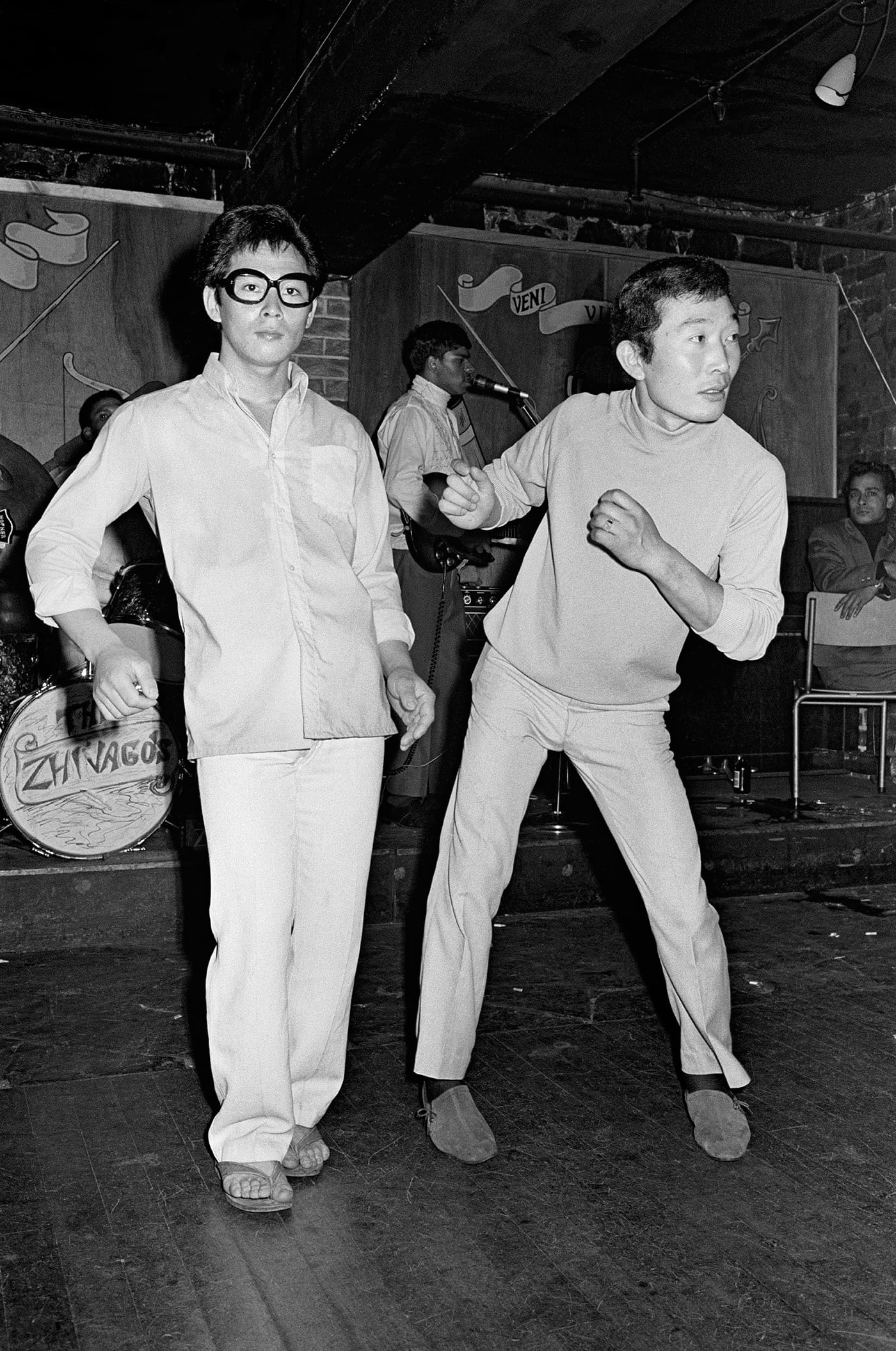 Monk’s pictures are simultaneously voyeuristic and actively engaged in their subjects’ lives. In one, two white nightclubbers — a transvestite with troweled-on makeup and sharply painted eyebrows and a man in a knit shirt and a suit — brandish cigarettes and half-filled glasses as they look unflinchingly into the camera’s lens, the latter sitting on the former’s lap; in another, from 1968, two young Asian men dance to the rhythms of the Zhivagos, a “colored” (mixed-race) band on a stage in the background, while in a third, from the same year, a chunky white man in shorts, knee socks, an open-neck shirt, and sports jacket straddles a chair, facing the camera with a peculiar, come-hither look whose coquettish air belies his size and tough-guy build.