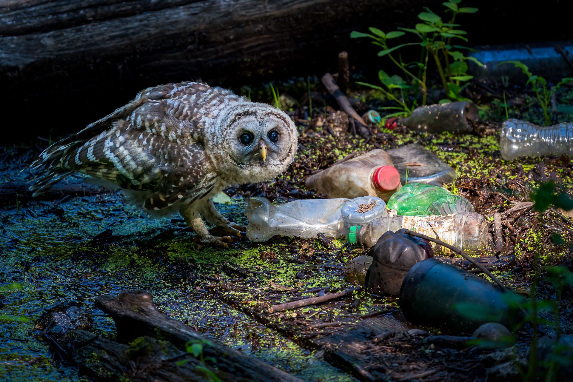 "The location is not a formal garbage dump as such, but rather a creek that runs through an urban park," said Kerry Wu, who took bronze in the "Urban Birds" category for her heartbreaking image of a barred owlet navigating human trash in its habitat.