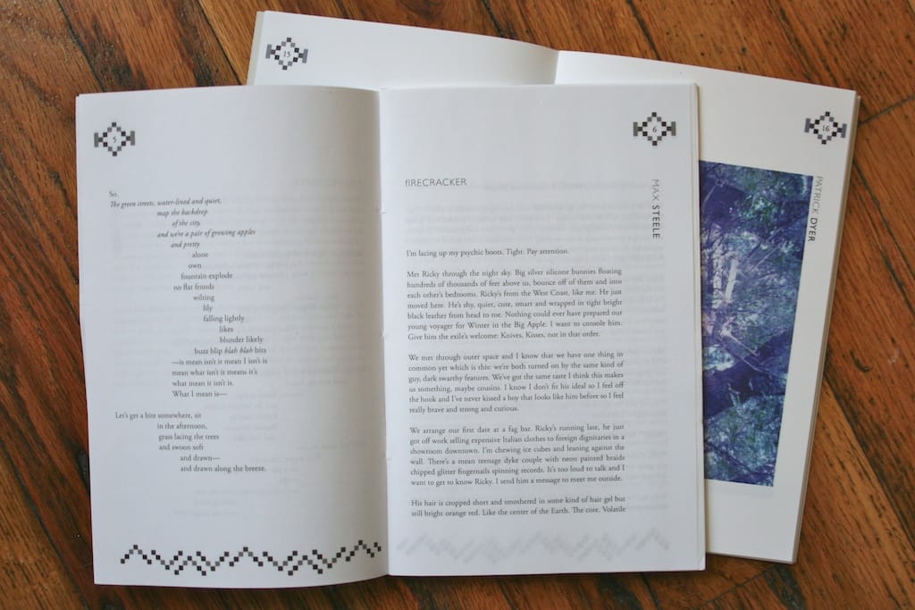 Birdsong’s writers tend towards the autobiographical; whether the pieces are explicitly fact or fiction is rarely discussed. With the better pieces, that doesn’t matter– Tommy Pico’s onomatopoeic “Making Paper” in Birdsong #13 moves freely between narrative and aesthetic riffing, a breath of fresh abstract air. Tatyana Kagamas’s “Leaving New York I” is a personal story that doesn’t get mired in itself. On the other side, Max Steele’s contributions are steamy, sure, but “fIRECRACKER” (#13) dithers into its own loose imagery. The poetry often works better than the prose, with the glaring exception of Marguerite Greenfield’s “Gone in the Vista Cruiser”, whose tight story telling deserves a book deal.