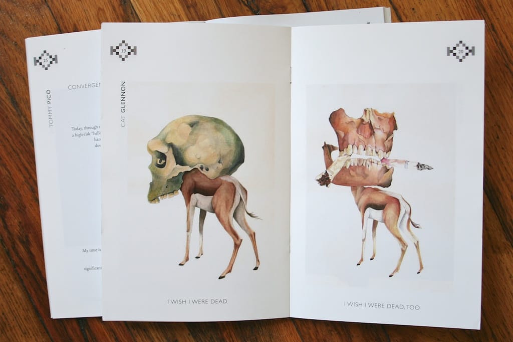 Of course, even if what’s inside doesn’t fulfill your expectations, Birdsong’s quality is visible even from its cover. Designed by street artist Blanco, the latest two covers are handsomely screen printed in multicolor on heavy stock paper and bound on the edge by bright threads. The printed covers both feature living things, #13 has bees (following the issue theme of buzz) and#14 has beautiful birds in black and white on pink (the theme is “anew”). Each issue also has a center section devoted to the visual arts, standout works including Cat Glennon’s slightly morbid watercolor mash-ups of antelopes and skulls, deemed “I Wish I Were Dead” and “I Wish I Were Dead, too”, and a striking forest photograph by Patrick Dyer in #14.