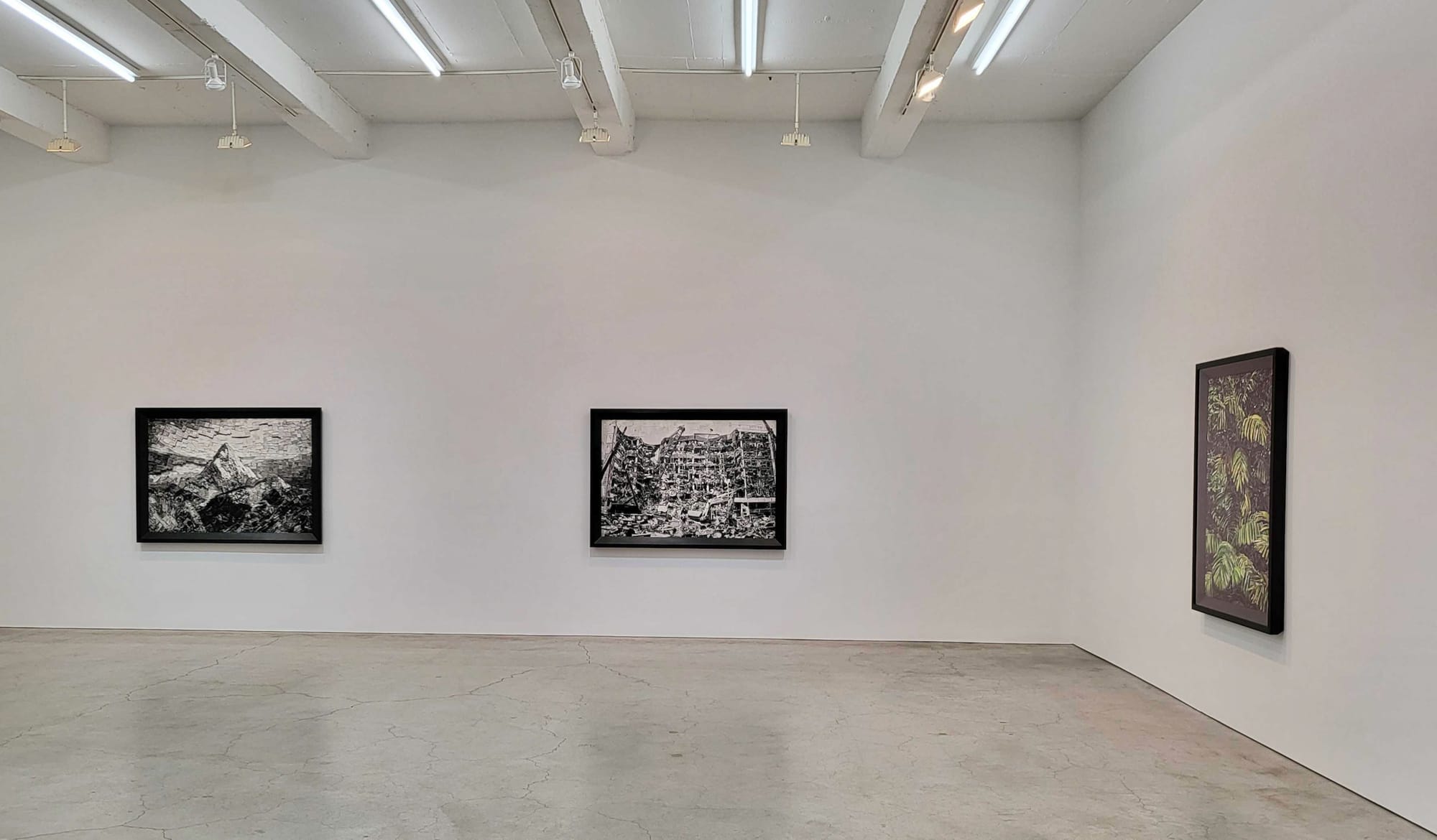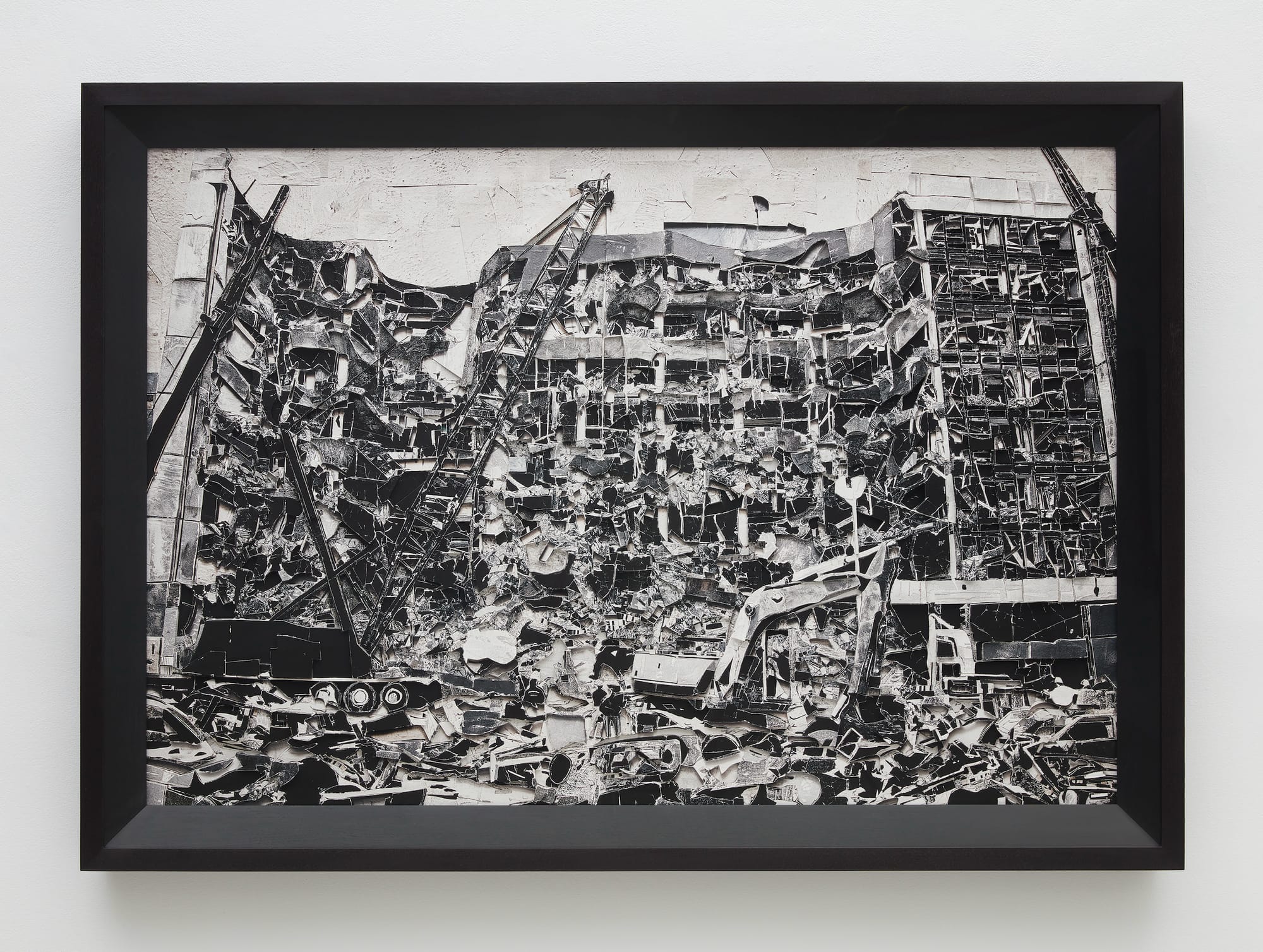 The work takes on historical resonance when the images represent collectively experienced situations such as “Oklahoma, Scraps” (2020), which eulogizes the Oklahoma City bombing of 1995. The piece reconstructs the bombed-out shell of the Alfred P. Murrah Federal Building. I and maybe others like me see that image and feel ravaged by it, want to staple and glue it back together. We do so because we know we could easily be subject to such arbitrary violence, hollowed out by it. I respond to this image intuitively, reaching to grasp what can’t really be held, that is, our humanity, and simultaneously drawing back to protect what suddenly feels in need of protection: our own fate.