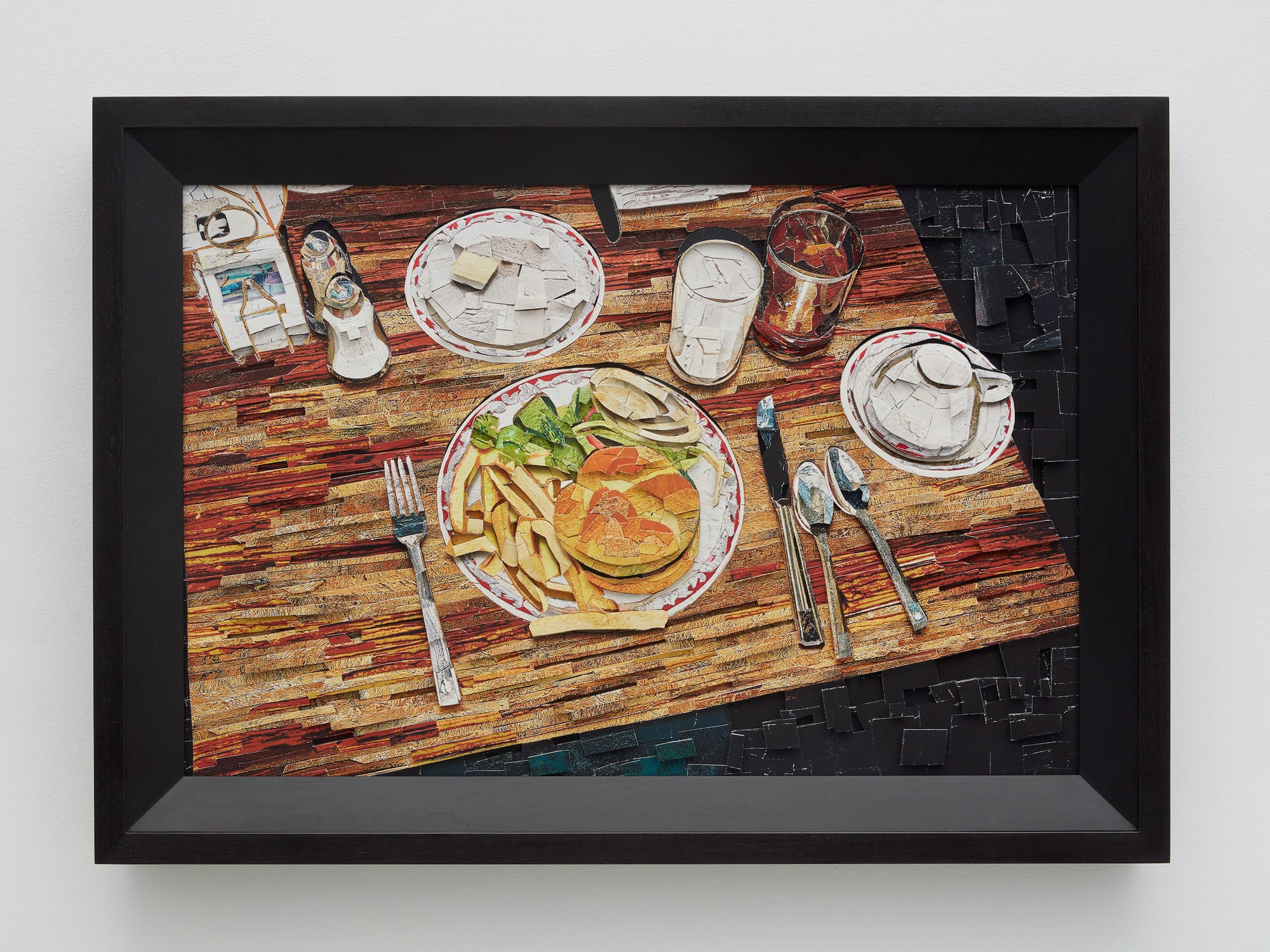 How Muniz achieves this is by taking abstracted, painted pieces that are arranged in a mosaic and then photographed, cut up, and then those shards are arranged into an image we recognize as representative of an actual reality, for example “Breakfast, after Stephen Shore, Scraps” (2021) which looks like a hamburger with fries and a side salad. These images feel utterly reminiscent of real, adult life, yet at the same time feel like something that happened long ago because they are, like distant memories, missing bits of detail here and there.