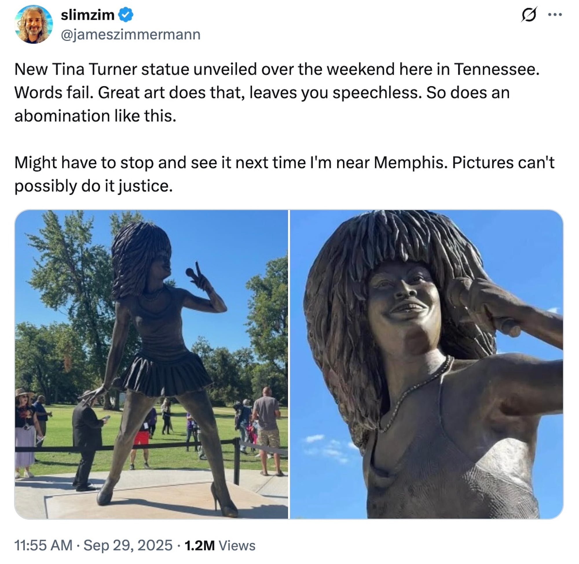 Unveiled at the end of last month in her rural hometown of Brownsville, Tennessee, a 10-foot bronze statue of the late singer-songwriter Tina Turner is going viral this week on social media, where users are calling it an “abomination” and “an insult to a great artist.”