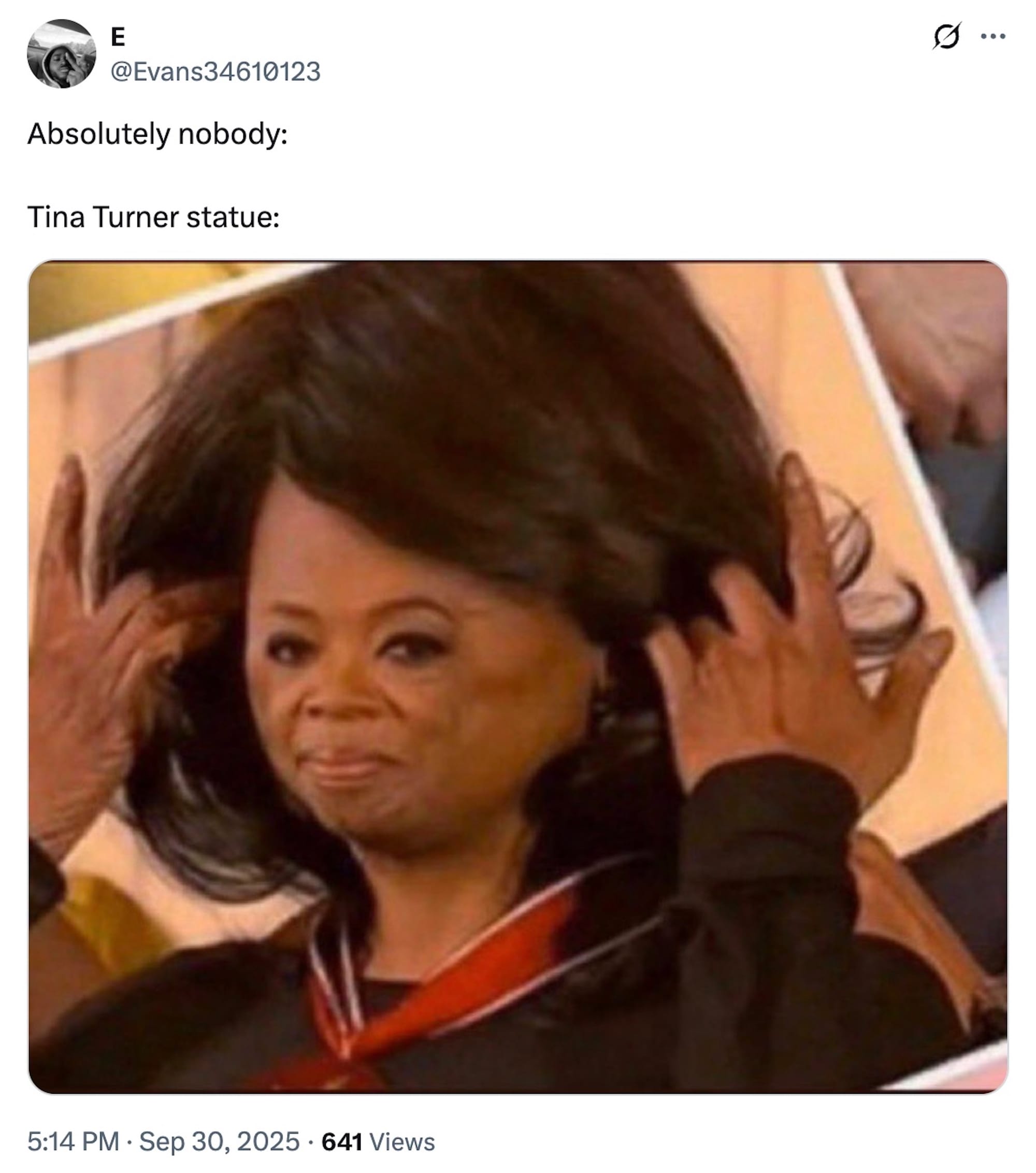 The towering sculpture depicts Turner in a short skirt and heels, mid-performance with a microphone raised in hand. But many commenters have fixated on the statue’s uncanny face or overly exaggerated, voluminous hair, which looks more like Cousin It or the truffula trees in Dr. Seuss's The Lorax than the famous gravity-defying wigs the singer was known to wear onstage.
