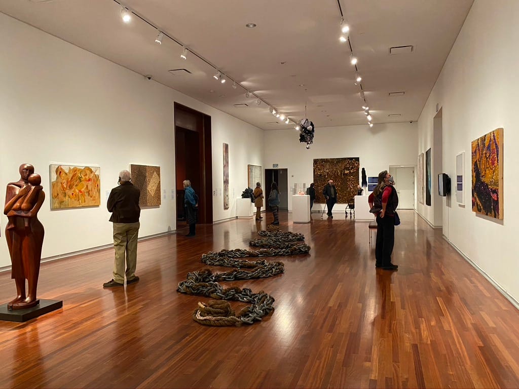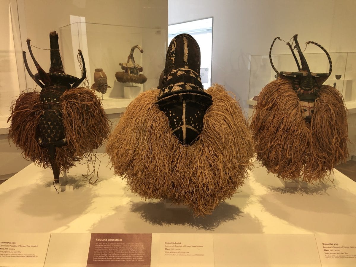 Front and center in the space is Chakaia Booker’s “Discarded Memories” from 2008. Comprising a corpulent knot of rubber tire strands, it stands at eye level. This leviathan leads our gaze into an adjoining gallery of “Arts of the Pacific” containing ancestor poles, shields, drums and masks from the Asmat culture of Papau New Guinea. A connecting gallery showcases the “Arts of Africa” from various peoples of the Congo.