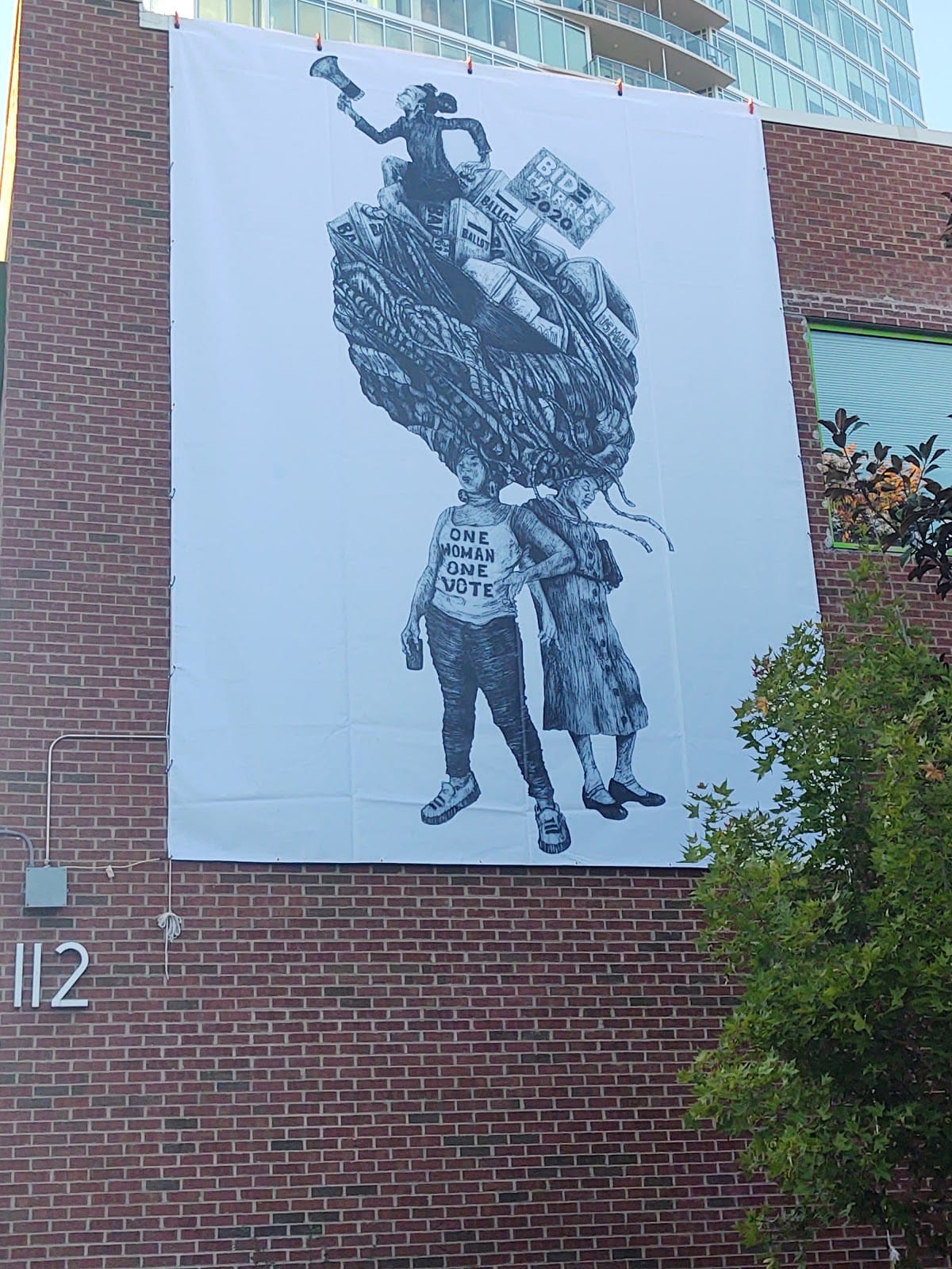 Artist Antoine Williams‘s mural in Durham, North Carolina, depicts voting and civil rights activist Fannie Lou Hamer standing next to a modern-day Black woman wearing a shirt that says “One Woman, One Vote.” Their heads are tangled, carrying a heap of ballot boxes and a Biden-Harris election sign. A third woman is speaking through a megaphone atop of ballots.