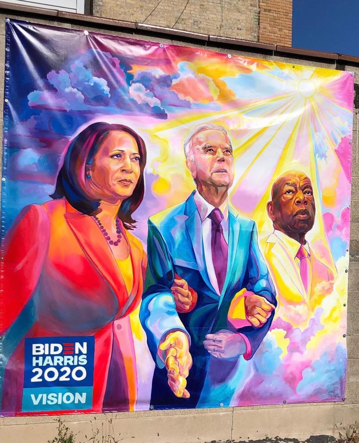 In Milwaukee, artist Tia Richardson‘s mural “Pursuing the Vision” depicts Harris and Biden arm-in-arm with the spirit of the late senator and civil rights activist John Lewis. The three gaze upwards to a sunny horizon.
