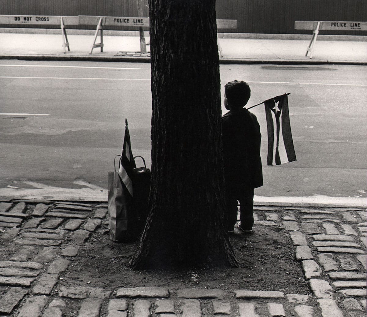 What about the child in “Boy & Doll, Lower East Side” (1966)? A broken and naked doll lies in the street, a foot or two away from the curb. An empty paper cup and other refuse lies between the doll, who is missing a leg, and the sidewalk. On the sidewalk, a few feet from the curb, we see a boy crouching behind a length of fabric wrapped around him, like a shield, revealing only his eyes and the top of his head. The space occupied by the boy fills the upper two-thirds of the photograph while the doll on the street takes up the lower third. It is almost as if the doll is on the orchestra pit with her head turned toward us, while boy is on stage, about to deliver his soliloquy. What will he say? Smith’s compositions are exquisite and necessary.