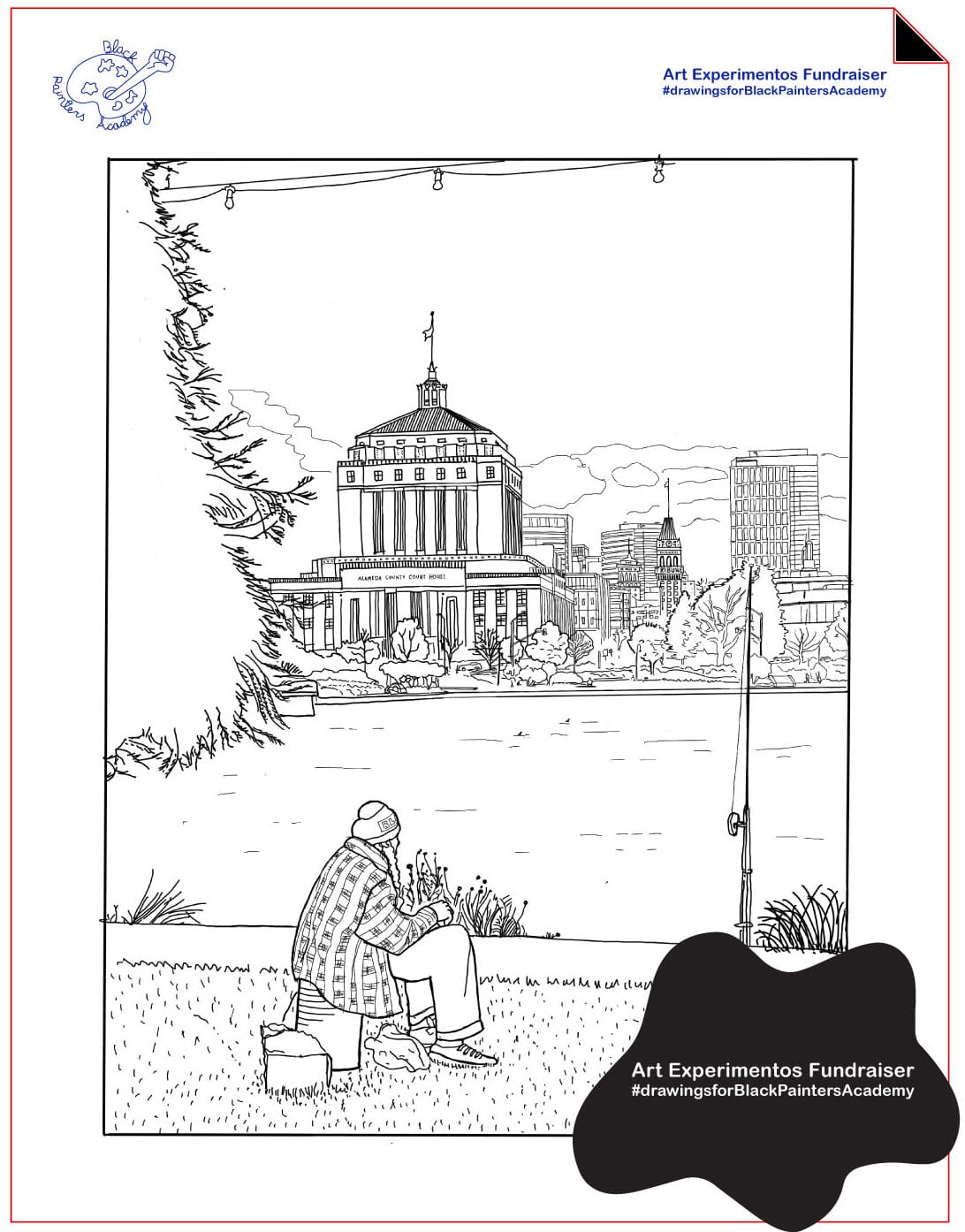 At the core of the Black Painters Academy initiative is the drive to spotlight Black artists omitted from art history; some works in the coloring book engage directly with the legacy of racism and inequality in America. "Alameda County CourtHouse" by Natalia Porter is part of a series of depictions of sites relevant to the Black Panther Movement. Spurred by recent demonstrations against police brutality, Porter, a Mexican immigrant who recently moved to California, wanted to celebrate the fundamental site of Panther protests in the 1960s.