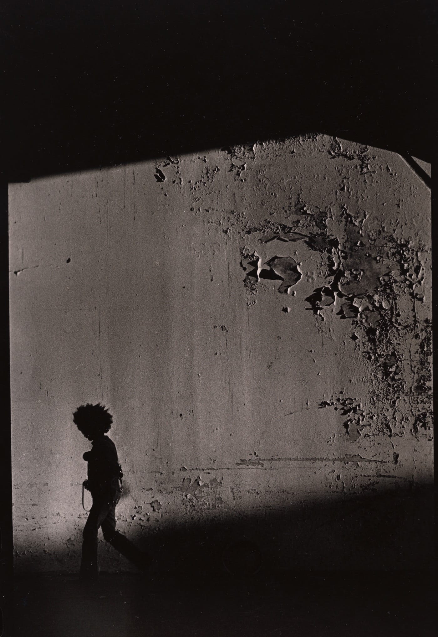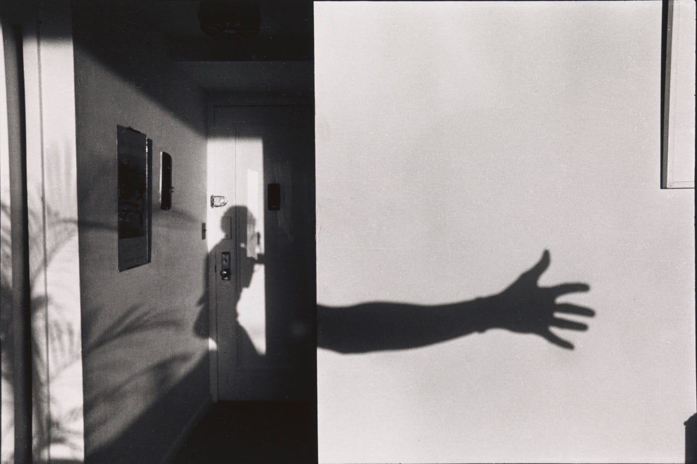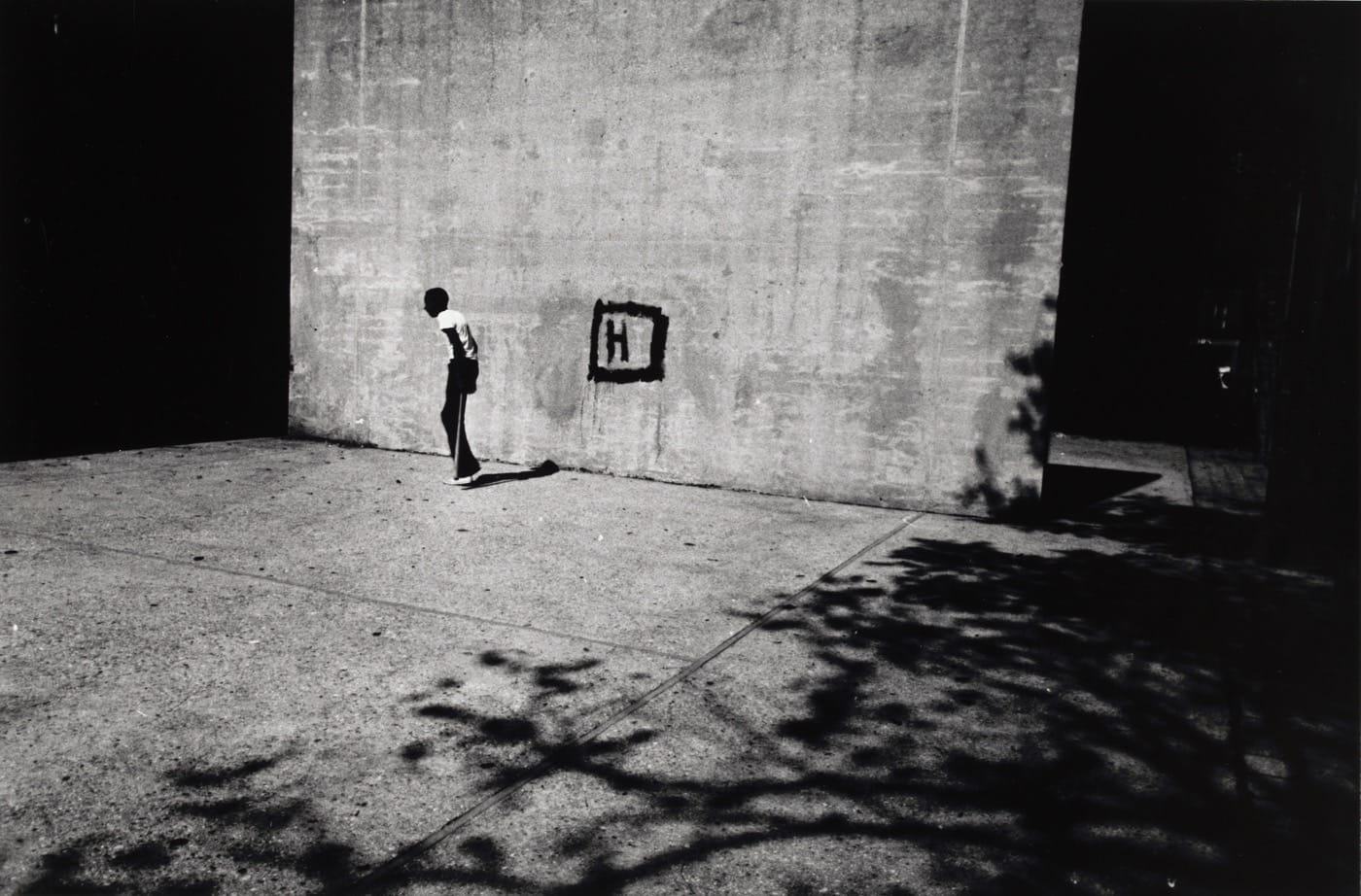 However, DeCarava was no Svengali. Younger photographers revered him but nevertheless found their own paths. “Boy and H” (1961) is an example of Draper’s career-long romance with the surrealism of city life and the geometric patterns that light and shadow imprint on film. A male figure, his frame twisted into a crude “S,” crosses in front of the concrete wall of a handball court on which someone has painted an enigmatic “H.” Similarly, Anthony Barboza’s “NYC Self-Portrait,” (ca. 1970–1979) shows the photographer at play, delighting in the patterns he creates with his body, the walls of an apartment, and the early morning light.
