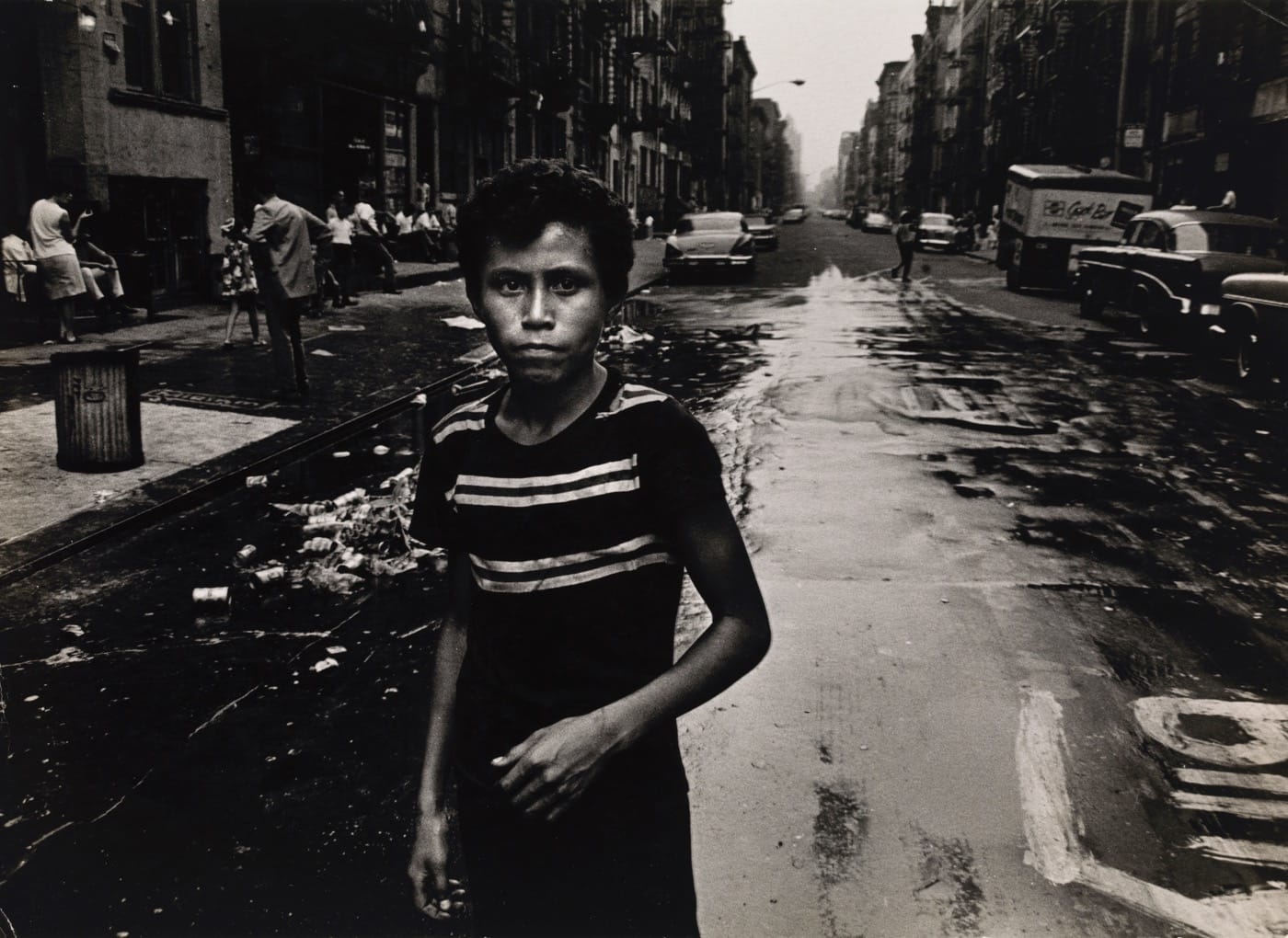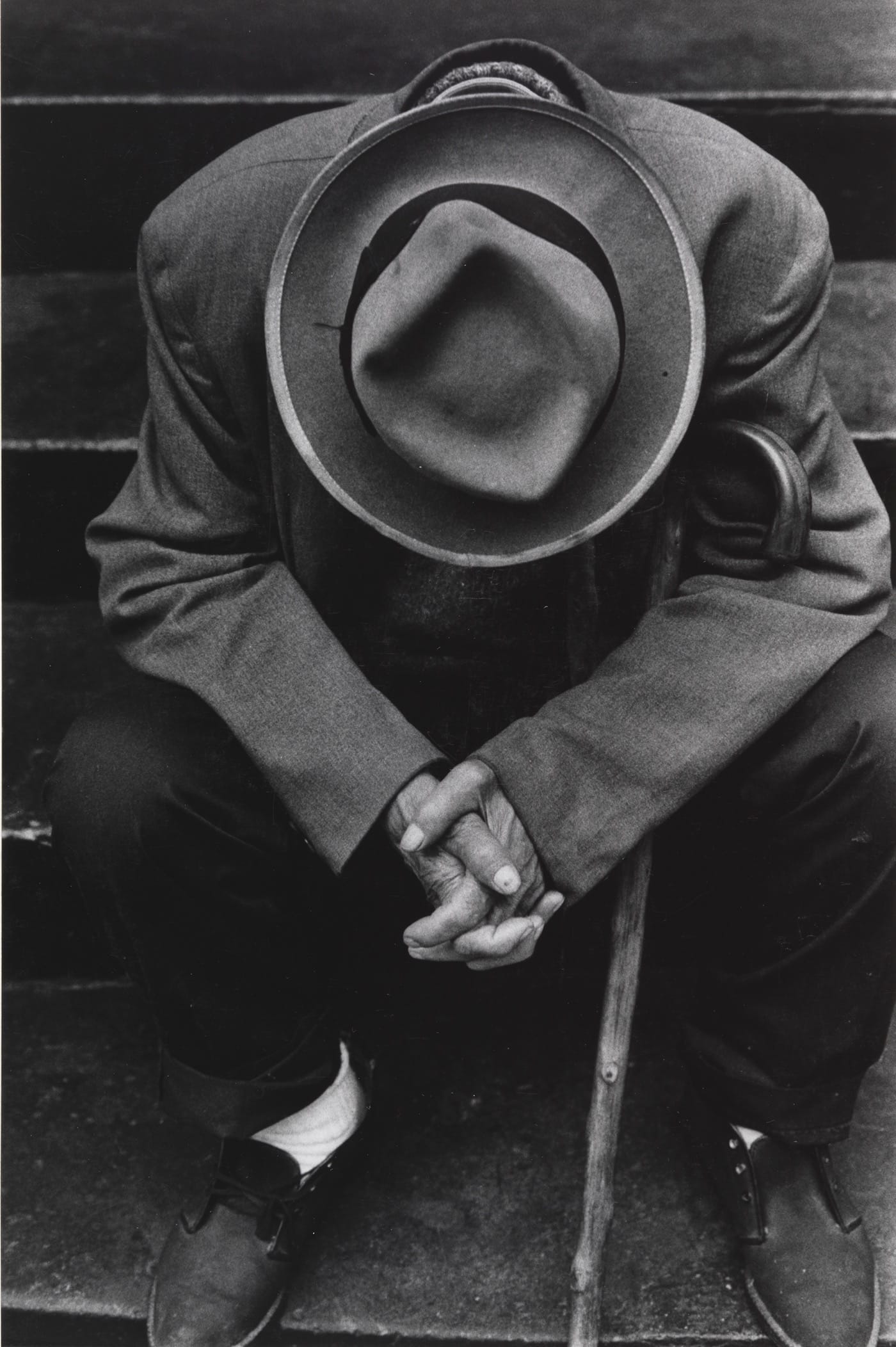 The young man in Louis Draper’s “Billy” (before 1974) might almost be an older David. He stands in the middle of a city street, wearing clothes that suggest it is again summer. The pavement is wet, perhaps from an open fire hydrant. Billy’s expression is hard to read, but his level gaze asks the photographer and, by extension, the viewer to see him as an equal. Beuford Smith’s portrait of a weary man, “Lower East Side,” (1969) also shows traces of DeCarava’s influence. The man’s face is hidden, but his battered fedora, clasped hands, and cane give viewers a sense of his mood and circumstances. The photograph’s dark tonalities resonate with much of DeCarava’s work, as does its embrace of ambiguity.