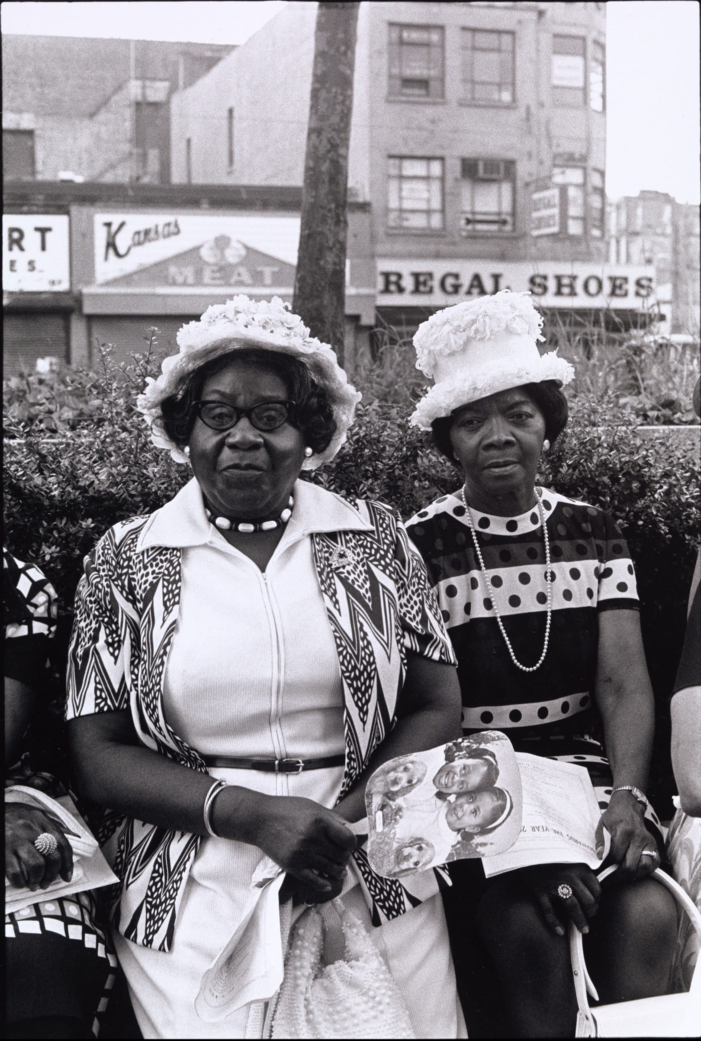 Like Draper’s photograph of Hamer, Ming Smith’s portrait of two anonymous, middle-aged black women takes part in the collective effort to visually reimagine black people. Smith was one of several female photographers included in the annual, but the only one who is represented in the installation. The women, especially the central figure, look into the camera’s lens with the same calm self-possession as Hamer. Elegantly attired, they seem to be dressed for church, as Ming’s title, “Amen Corner Sisters,” (ca. 1976) confirms. Wearing their hats like crowns, they hold themselves with the bearing of a queen and her lady-in-waiting, an impression that the word “Regal,” seen on a building across the street behind them, reinforces.