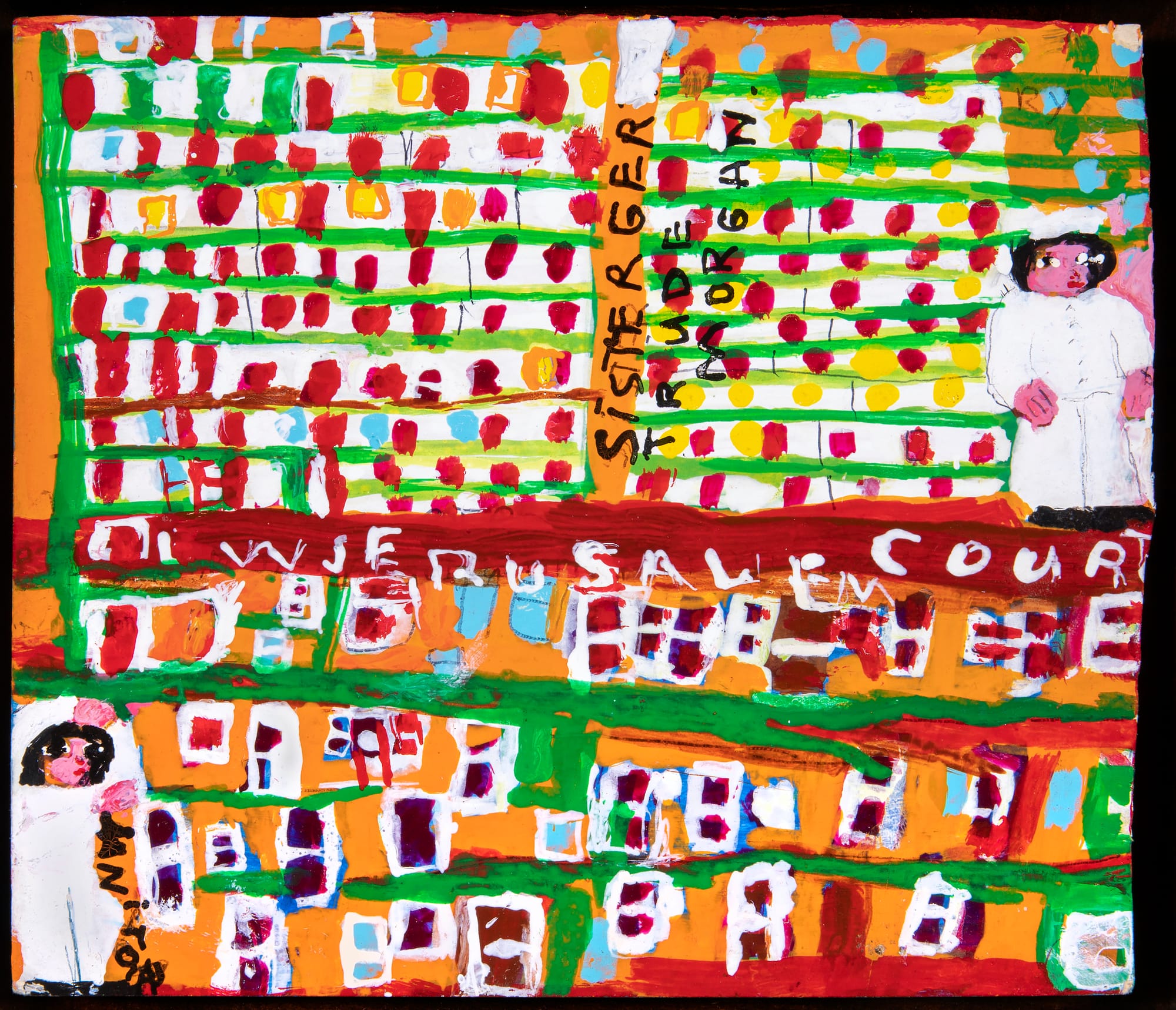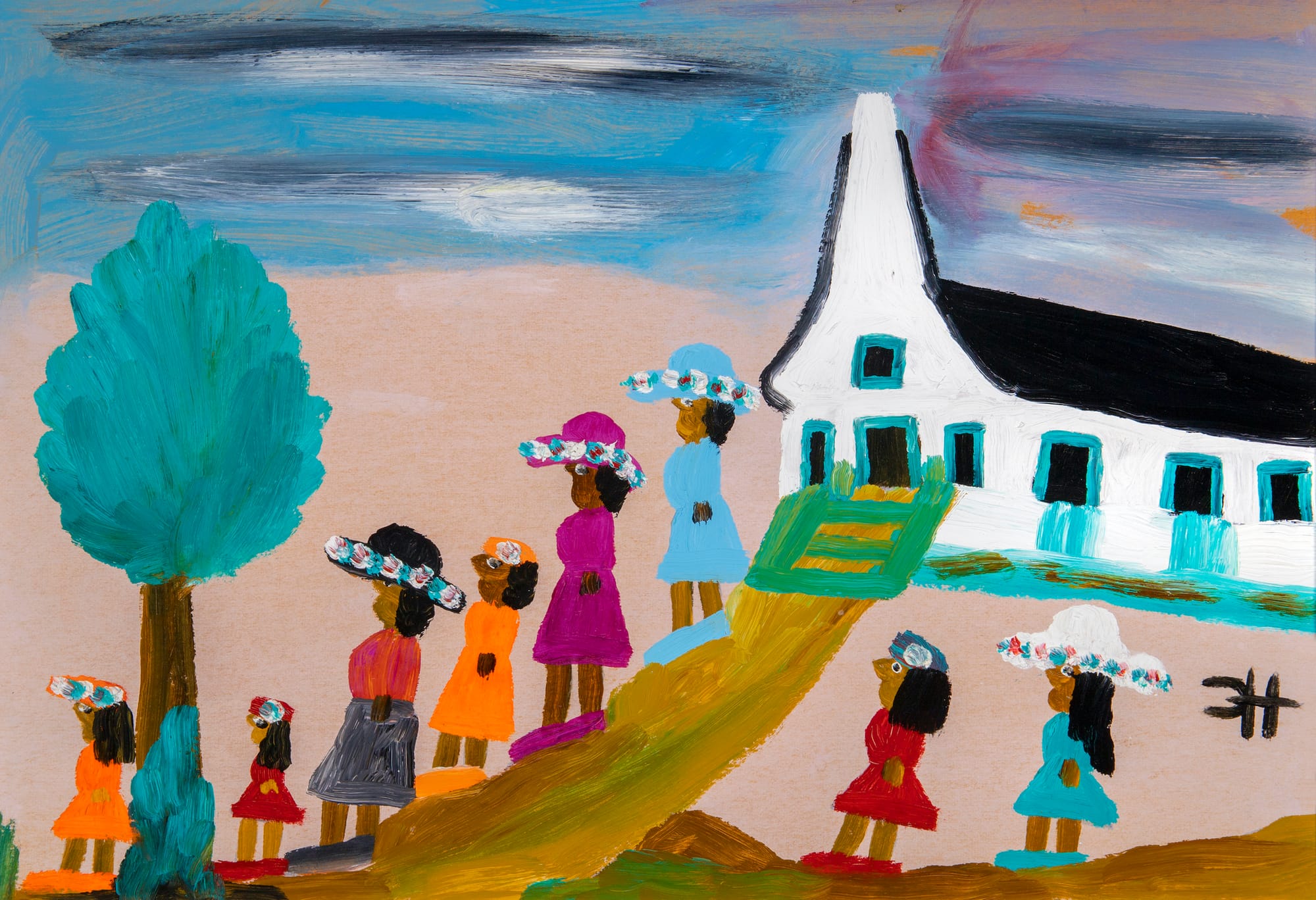 Some artists, like Clementine Hunter and Sister Gertrude Morgan, painted scenes that are pulled directly from their lives or religious studies. Hunter’s oil painting, “Coming from Church,” depicts women and young girls in bright dresses and hats leaving a white church, the flat landscape a swirl of blue-lavender and pink. The scene celebrates the everydayness of life, while also hinting that the threshold between sacred and secular exists everywhere.