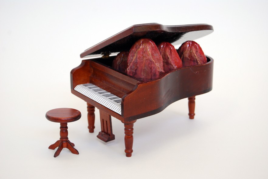 However, the found figures in Harrison’s work are mass-produced, the personal emotion of clay-work eschewed in favor of a machine process. Through Harrison’s alterations some of that emotion of the body returns, although in a very visceral way. And that’s meant quite literally: the collectible ladies cradle their spilled guts or present their extracted hearts while maintaining cheery visages.
