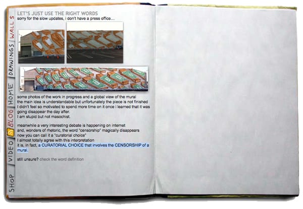 Artist Blu has just blogged about his surprise that the word “censorship” is disappearing from the discussion of his whitewashed mural and being replaced by the word “curatorial choice.” He also reveals why the mural isn’t as finished as some of his other work: