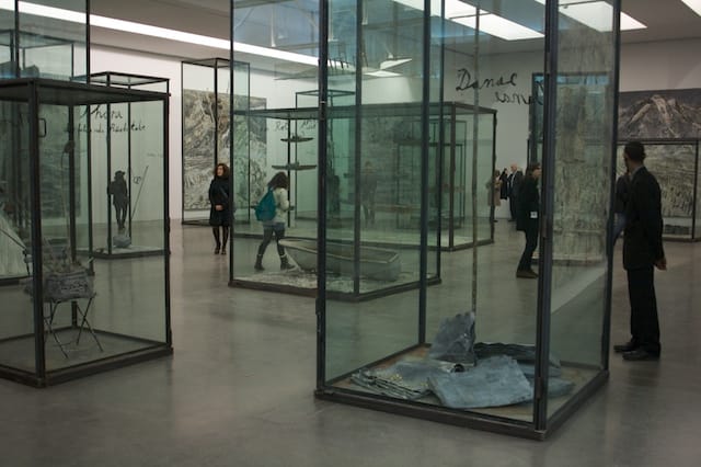 Kiefer’s new show at Gagosian was the one I looked forward to most on this trip, after seeing the artist speak not long ago. But then when I heard that the exhibition’s works were nearly all encased in glass vitrines, I started expecting the worst. As it turned out, the show was probably the biggest disappointment of the day. Sure, the artist’s hallmarks were all there, the tar-like neo-expressionist brushwork, the self-referential and self-mythologizing symbolic code, the pallets sprouting wings. Yet the fact that these fascinating sculptures were behind glass basically killed them. The knotty texture of Kiefer’s materials was totally downplayed in favor of the shine of the glass, a barrier that divorced me from further engaging with the actual sculptures. It’s like collectors realized stuff was falling off of their paintings and demanded that the detritus be protected.