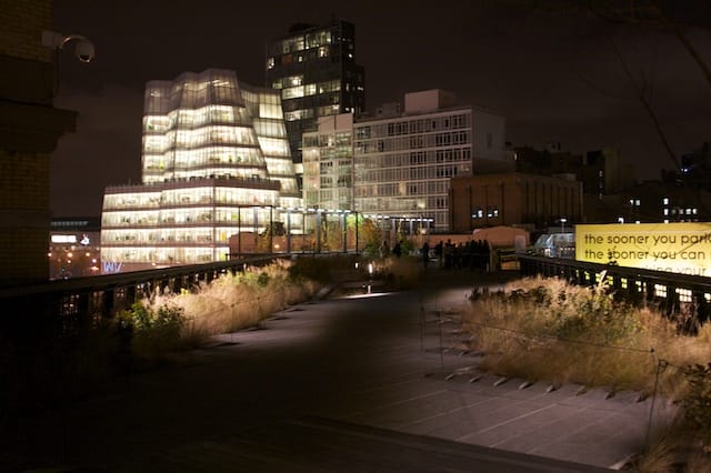 On your way back from Chelsea after a long, hard day of art-looking, I highly recommend checking out the High Line at night. Looking back over the gentle swaying grasses and out onto Gehry’s shiny condo is a refreshing respite from all the white cubes. Plus, no buying required!