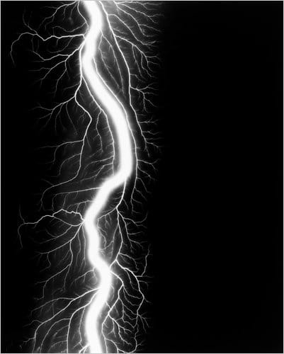 That’s all great, but though the pieces are beautiful, there’s still something missing from them. I had a tough time getting a hold on these works because their surfaces were so relentlessly slick, the photographic paper so glossy that the lightning strikes’ violence and spectacle are almost negated. There’s a grace to how well Sugimoto makes the electricity dance, but it doesn’t always make for a powerful piece. I’d like to see the next exhibition that the artist incorporates these ideas into; it’s a work in progress.