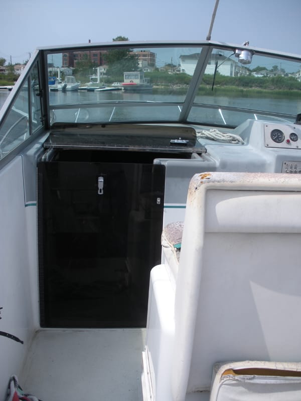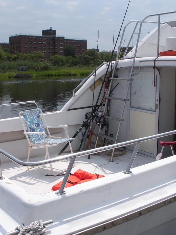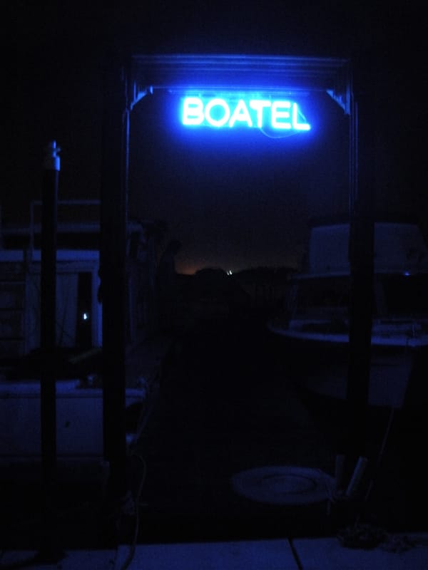 Some mainstream press about Hockaday’s boatel in early July, causing spots to sell out almost immediately. Guests that managed to snag a night — for either $50 or $100 depending on the vessel — must venture out to Far Rockaway, and then to the end of the marina’s C dock, where they encounter a neon blue “Boatel” sign. There the refurbished vessels await them, castoffs that radiate ratty charm and boast names like Crumb, Americano, Queen Zenobia and Nancy Boggs.