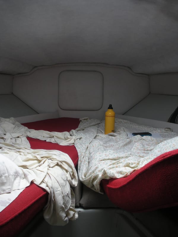 Gradually the gathering wound down. People who didn’t know each other drifted back to their own groups, and then to their own boats; my friends and I settled into the Americano and actually managed to sleep ( I did, at least). In the morning, we emerged to a quiet stillness. Only one or two people could be seen moving around on shore. An air of tentativeness hung over us, and, it seemed, over the whole boatel. We had made it through the night — we had slept on a boat. Now what?