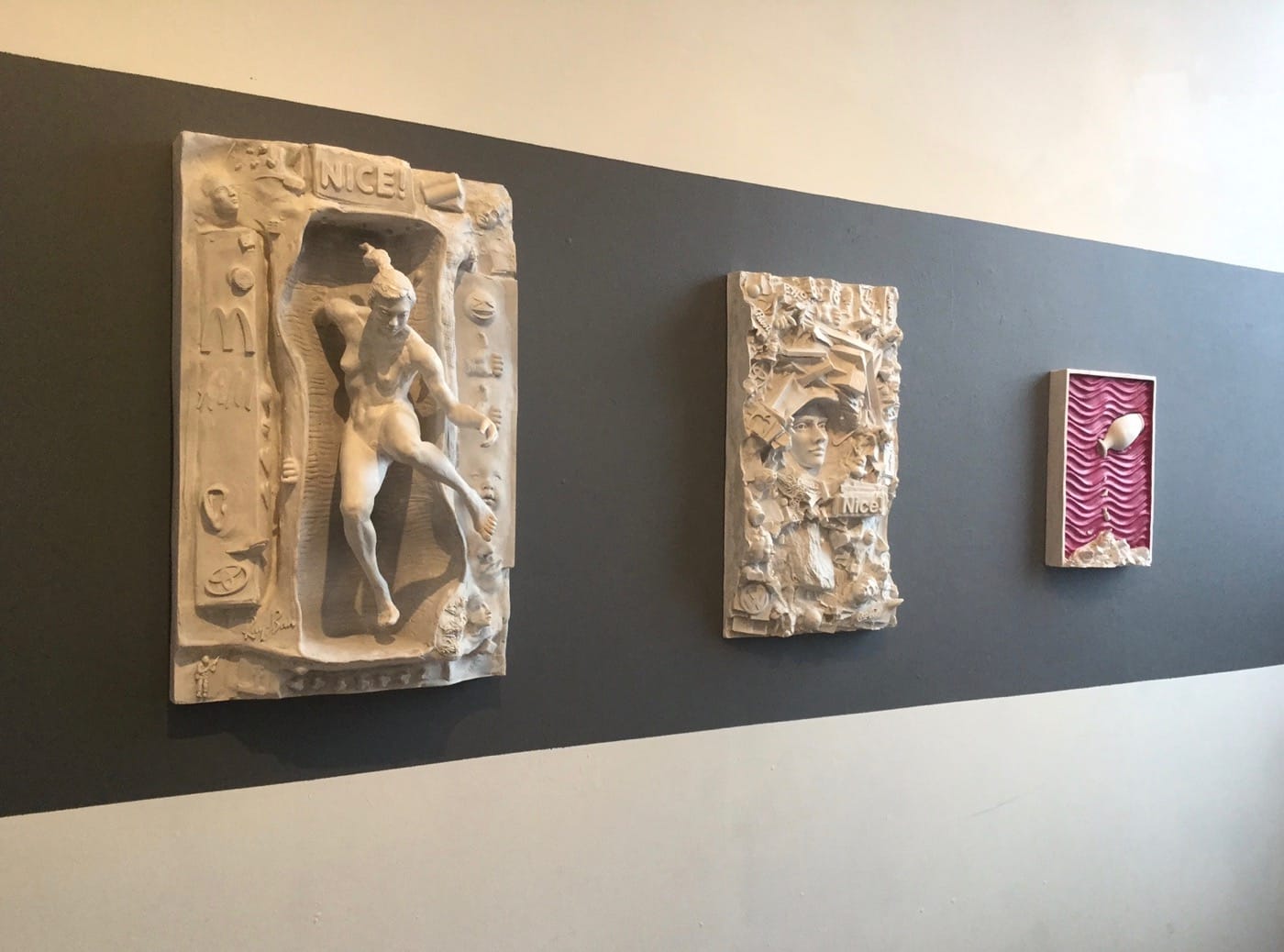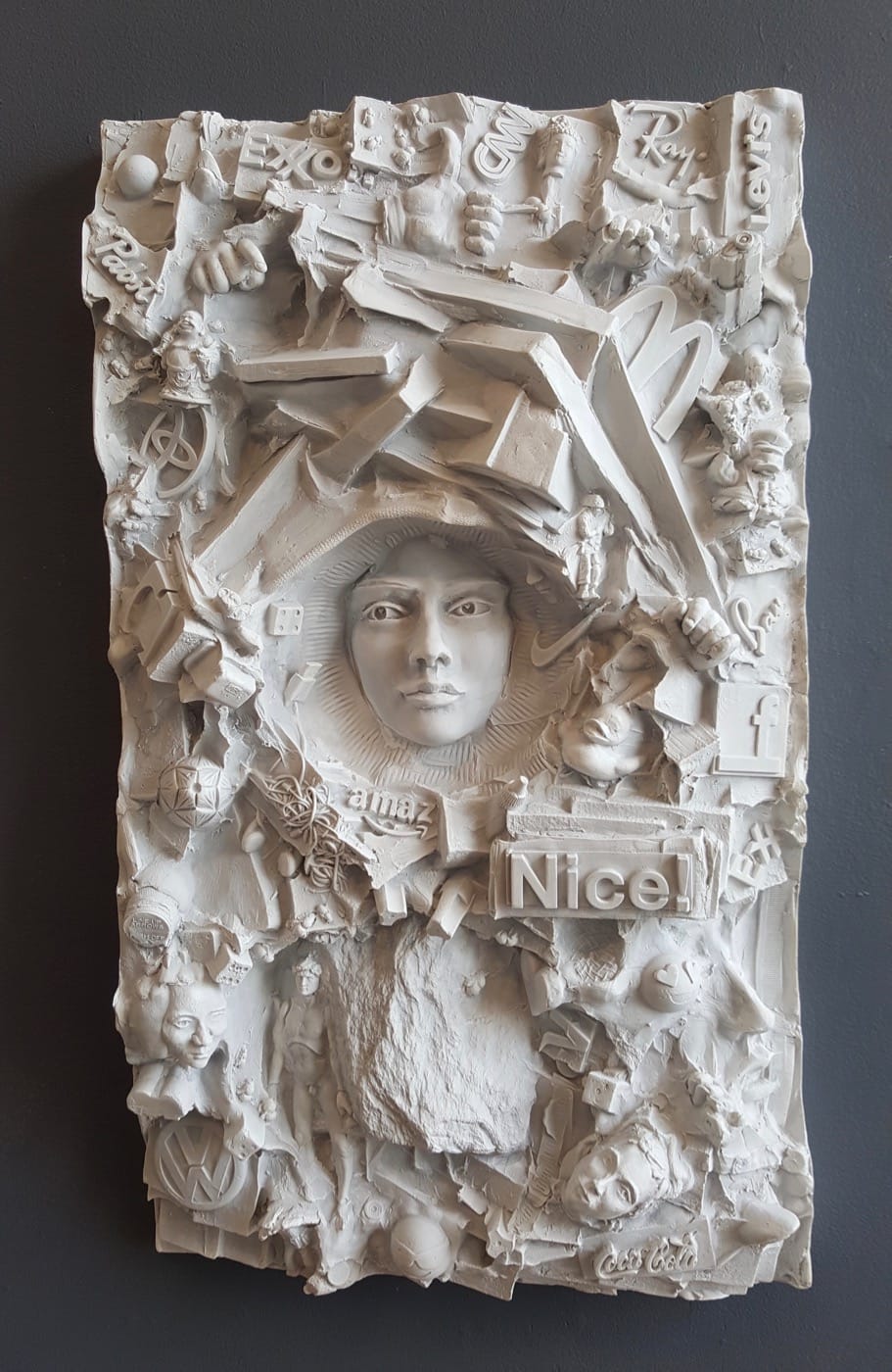 You could just run away. This occurs to me when I revisit images of Bob Clyatt’s high relief wall sculptures in his current exhibition at Anthony Philip Fine Art. Mostly the pieces are Carrara marble, imparting a placid, chalky white appearance that runs counter to the deliberate chaos of the compositions. Here and there are spots of color though: shiny polyhedrons of mosaic glass or a face that’s darkened by pigment. There are many faces, generally doll like and serene, and they are mostly floating among or drowning in a disorderly mass of branded signs and symbols — the communicative and consumerist appurtenances of contemporary life. Take “Cscape #28” (2016), which depicts a feminine, white European-looking face in the middle of a gallimaufry: logos for Volkswagen, McDonalds, Coca-Cola, Amazon, Ray-Ban, Exxon, Facebook, CNN, and others, along with USB cables, emojis with valentine hearts for eyes, a rubber duck, a toy soldier, the muzzle of a handgun, child-resistant caps to prescription medicine bottles, a “thumbs-up” sign. If a tsunami slammed into a thriving metropolis and leveled it to the ground and then froze solid, a small one-foot by two-feet section of that hellscape might look like several of Clyatt’s pieces here.