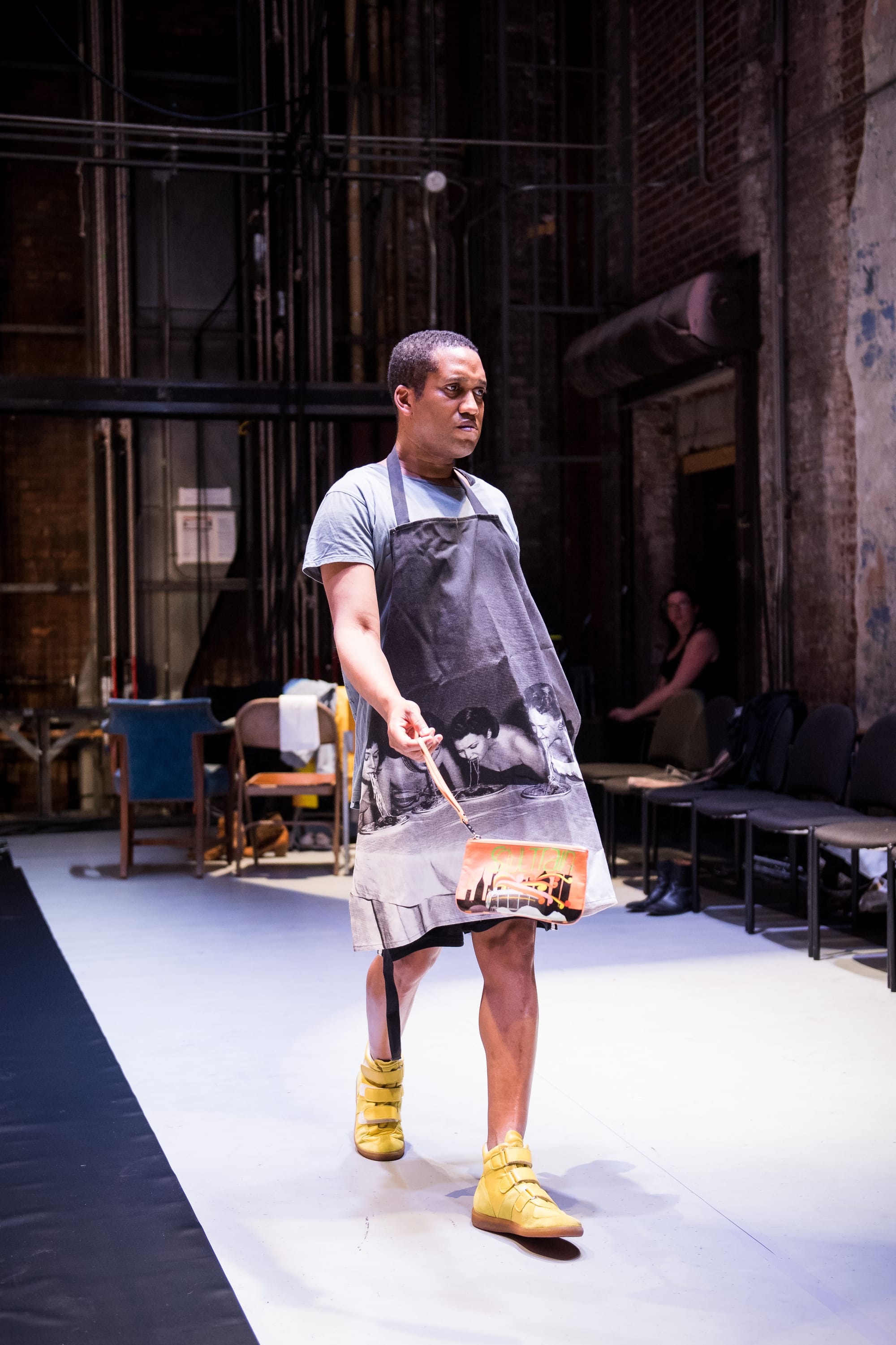 Trajal Harrell brought his signature piece, Twenty Looks Or Paris Is Burning at the Judson Church, the (S) or “Small” edition, to the Abrons Arts Center as part of the American Realness Festival. Harrell presented (S) at the New Museum in 2009 and has developed several related works in different “sizes” under the umbrella title of Twenty Looks, imaginatively dealing with the Judson Church dance revolution downtown in the 1960s and the separate uptown eruption of voguing. In the large auditorium at Abrons, Harrell placed the audience on the stage with him for the performance. The seating seemed to imitate a fashion show in a tent, with rows of viewers sitting close to the action along the length of a walkway. In (S), Harrell transforms himself with different “looks,” costuming as drag or role-playing, performing a wild hopscotch through the fields of gender, race, geography, high and low culture, and class. He changes in full view of the audience, indeed within inches of the front row, before strutting out on the runway or dancing across the stage. He uses a common spiral notebook with handwritten numbers as a signboard, draping it across the back of a folding chair, and flipping the pages to help the audience follow along with the numbered looks in the program. His quivering presence animates the performance throughout, which includes tongue-in-cheek elements, as when he turns on a fan in plain sight and allows it to inflate his superhero cape while flying, feet on the ground.