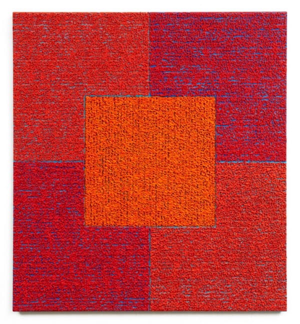 And just as we can still rock out to the Beetles, abstraction can still offer us something special. Some may think that abstraction is an “expired” or “dated” mode of art but that is so narrow-minded. After all, if you have actually assimilated your theory, you would be critical of the entire concept of art history as a progression through different chapters that leaves certain retrograde styles behind. On a more sensual and tangible level, a rich burst of color, like Sloane’s “Red Red Orange Square” (2010), goes a long way.