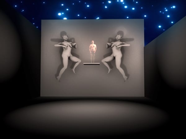 Hart fills the space with white floating animated figures. They make small and simple movements while glowing ethereally in the dimly lit space. The animation was fluid, lifelike and haunting. Vaguely Tibetan dub-step music hummed on in the background but it gelled together into a trippy meditative vibe.