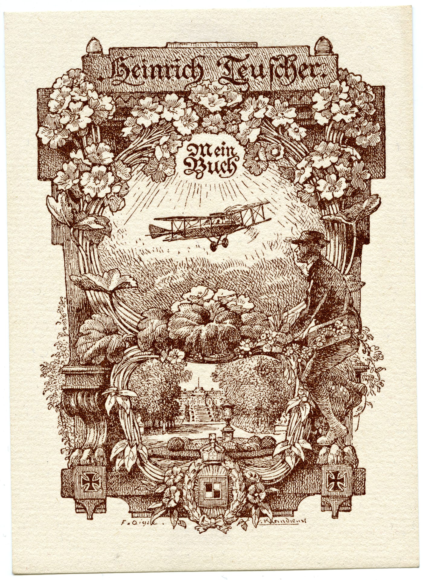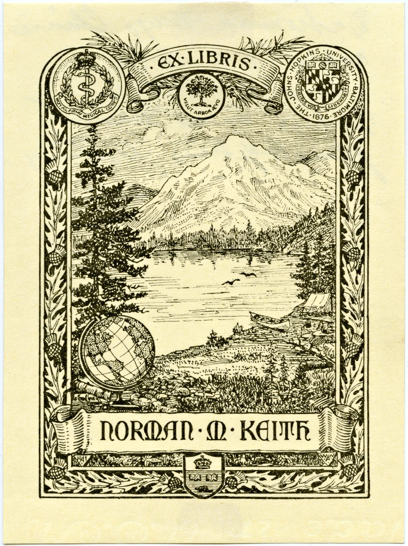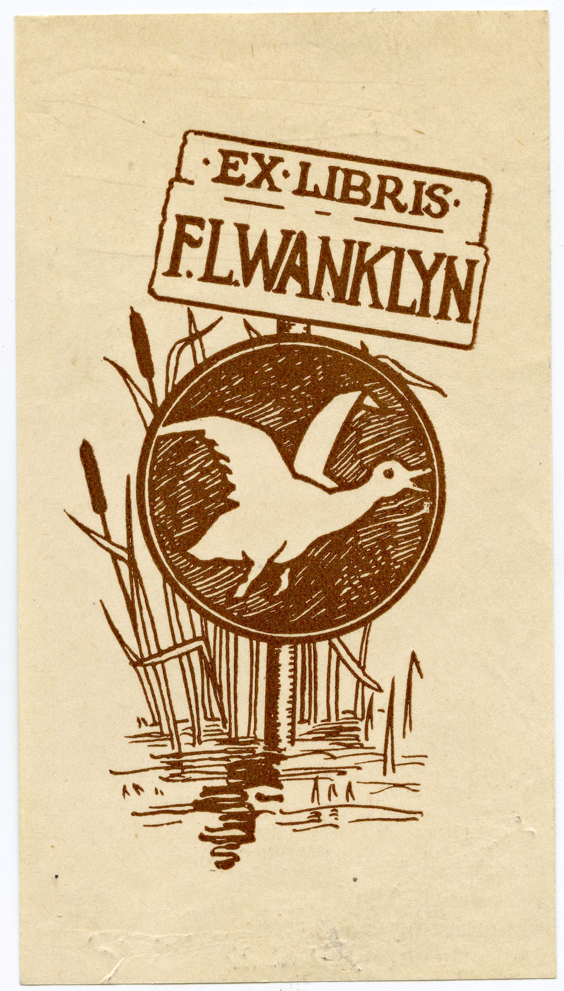 Brown ink on cream colored paper bookplate with German symbolism picturing a plane with a gardener watching on (1922). Heinrich Teuscher was born in Berlin and worked there as a horticulturalist and landscape architect. In 1922 he immigrated to Boston and later worked at the Morton Arboretum in Chicago, the Boyce Thompson Arboretum in New York, the New York Botanical Garden, and the Jardin Botanique de Montréal (courtesy Thomas Murray Collection, University of British Columbia Library)Bookplate with a male figure riding a Pegasus (United States, 1904). May have been illustrated by Edward J. Wheeler (courtesy Thomas Murray Collection, University of British Columbia Library)Bookplate feature a lakeside camping scene framed by Scottish thistles, with logos representing the Royal Army Medical Corps, the University of Toronto, and Johns Hopkins University (United States, 19141). Norman M. Keith attended the University of Toronto and was with the Royal Army Medical Corps in WWI. He later worked at Johns Hopkins Hospital in Baltimore (courtesy Thomas Murray Collection, University of British Columbia Library)Art Deco style bookplate (Antioch Bookplate Company, 1930-69) (courtesy Thomas Murray Collection, University of British Columbia Library)Brown ink on white paper bookplate with a flying duck (Wanklyn, 1900-69). Frederic Lumb Wanklyn was a business executive based in Montréal (courtesy Thomas Murray Collection, University of British Columbia Library)Bookplate with an escutcheon quartered per cross (1881) (courtesy Thomas Murray Collection, University of British Columbia Library)Colour woodblock print bookplate (Japan, nd) Frederick Claude Vivian Lane (1880-1969) was an Australian printer, and the country’s first Olympic swimmer (courtesy University of British Columbia Library)Blue, pink, yellow, gold, and black ink on cream paper bookplate (Rustcraft USA, 1930-69). Gertrude Elliott was an American children’s book illustrator (courtesy Thomas Murray Collection, University of British Columbia Library)Red ochre ink bookplate with an open book and beehive (Québec, nd) (courtesy Thomas Murray Collection, University of British Columbia Library)
