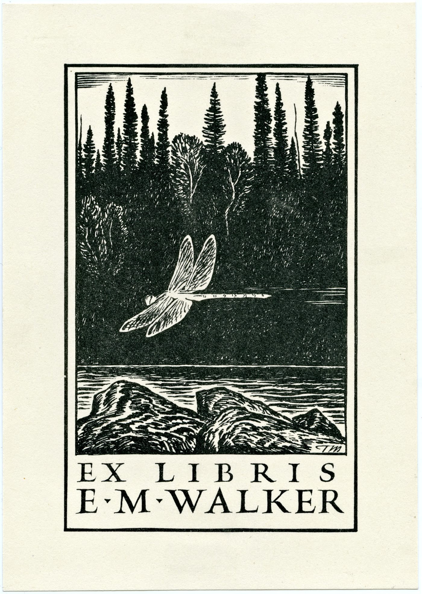 Black in on white paper bookplate with a dragonfly (Toronto, 1930-69). It was illustrated by Thoreau MacDonald, a Group of Seven founder and a leading Canadian book illustrator (courtesy Thomas Murray Collection, University of British Columbia Library)