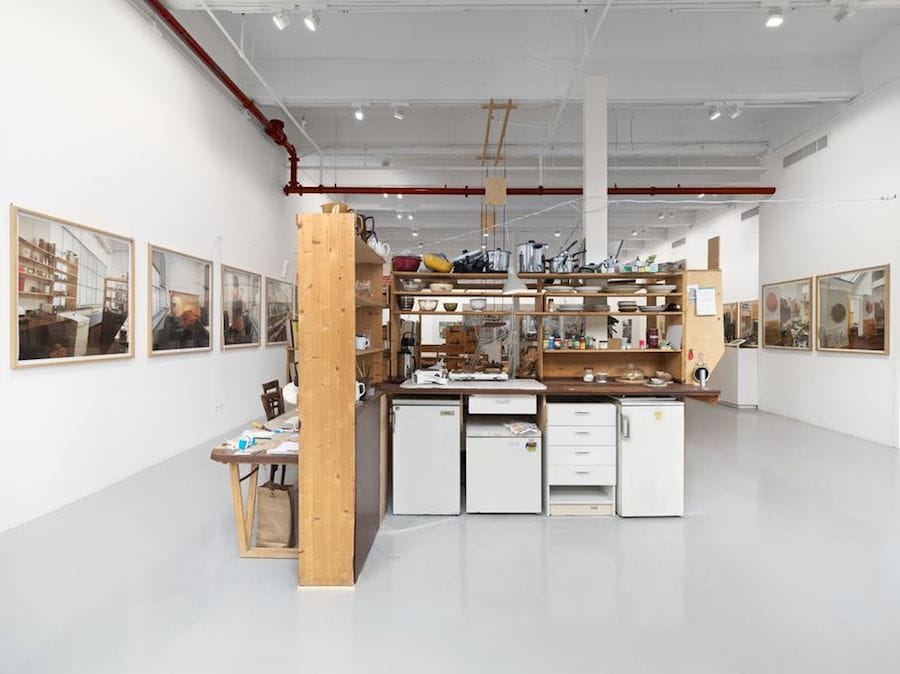 “Studio” is literally the studio that the Roths shared from 1995 to 1998 in Switzerland, along with over-painted photographs of the studio by Björn Roth. Following his father’s death in 1998, Björn catalogued the contents of the space with the intention of recreating it as an artwork. “The Studio of Dieter and Björn Roth, Ackermannschof, Basel” (1995-2008) is installed in the gallery’s main floor front room.