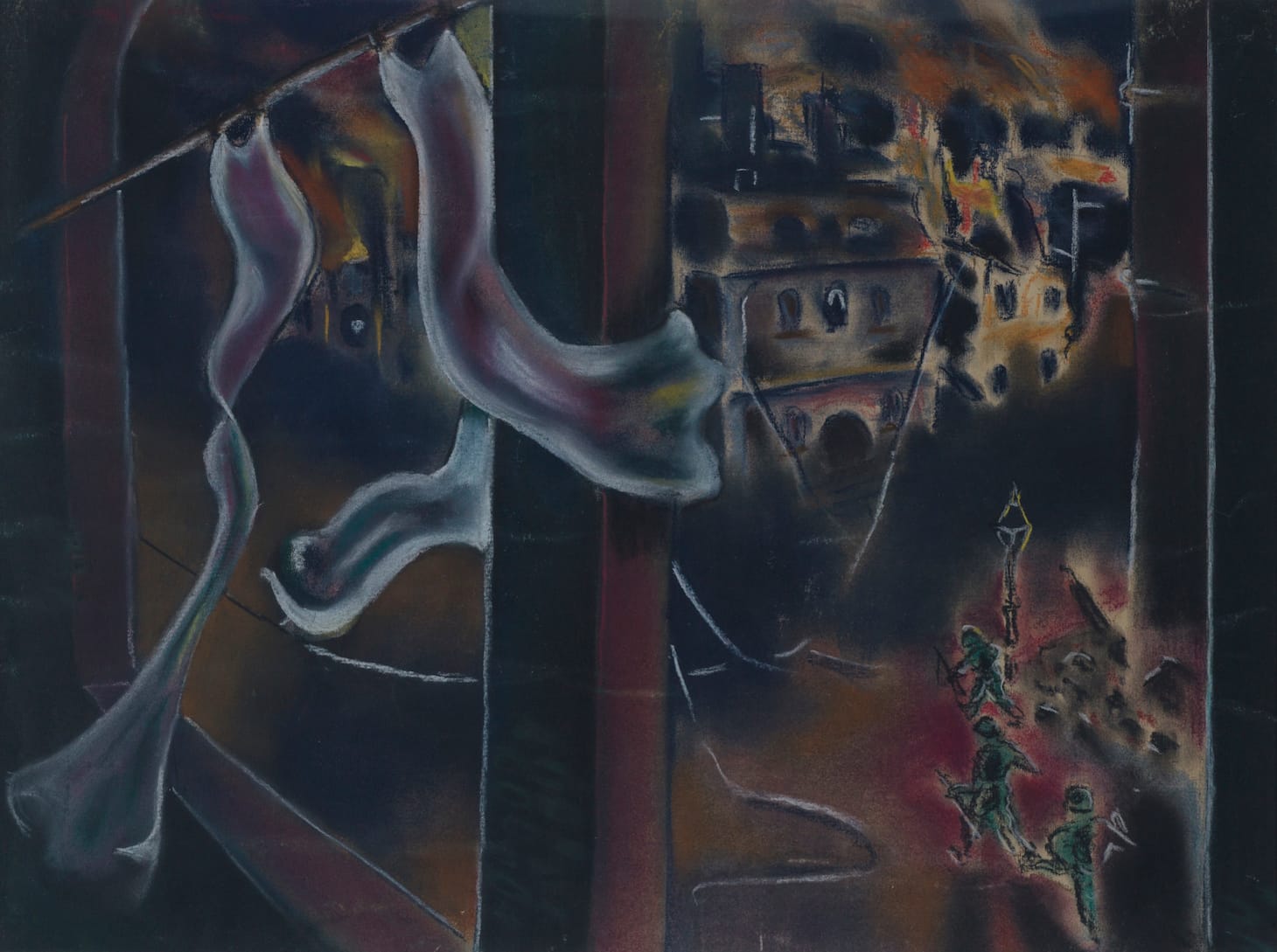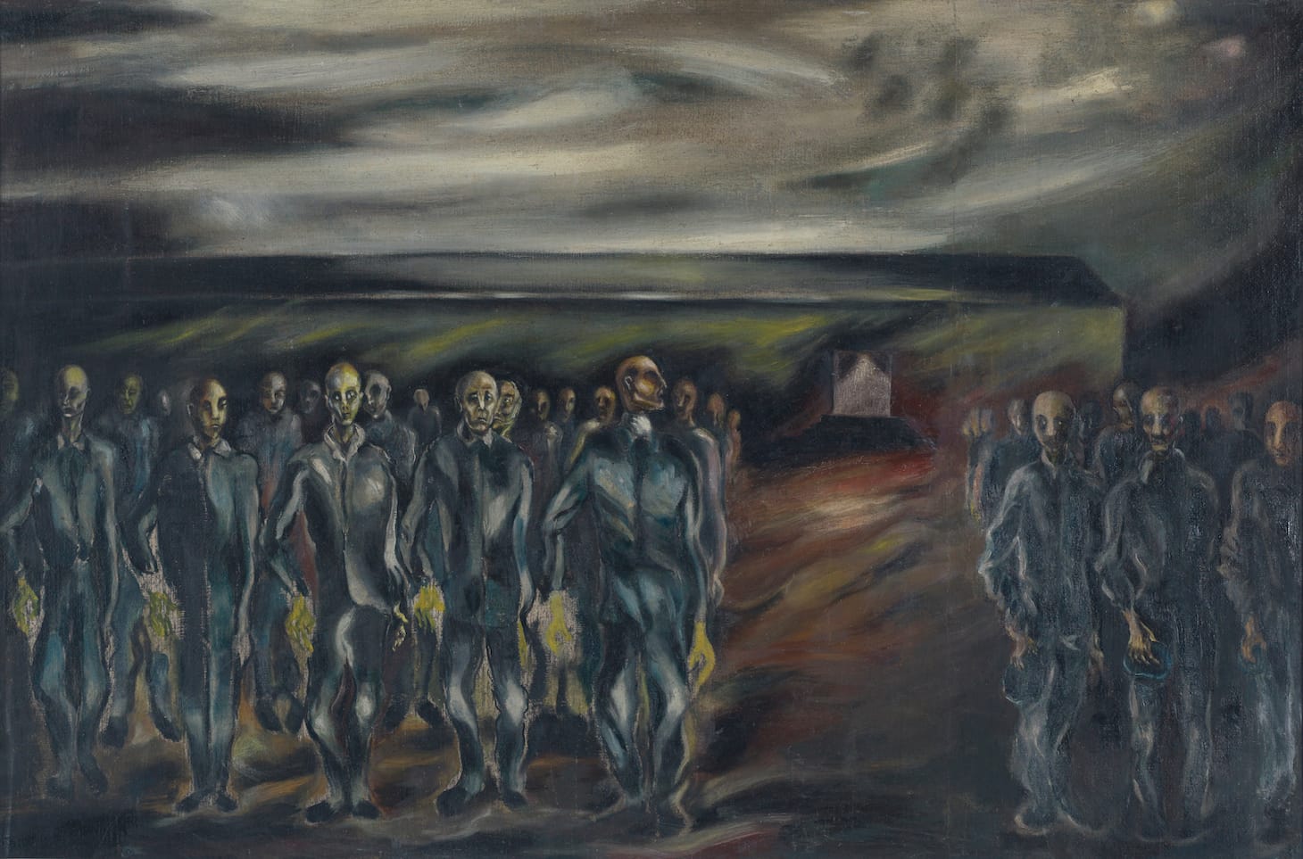 In “Roll Call,” multiple rows of skeletal figures wear blue uniforms and stand at attention. Behind them are the barracks. “Liberation” positions the viewer at a high vantage point, watching through a broken window as soldiers rush toward a structure and, in the distance, buildings go up in flames. Two white narrow curtains flap in the wind. The drawings are close-up images of individual guards and prisoners. It’s amazing that these works exist at all, but in themselves they scarcely constitute a full visual record of the Holocaust. “In Concentration Camp” is a different kind of image. Here three figures are seen close up, staring vacantly into space. Other figures grouped in the distance are rendered as white forms. Are they the victims or their ghosts? Lurie doesn’t make this clear.