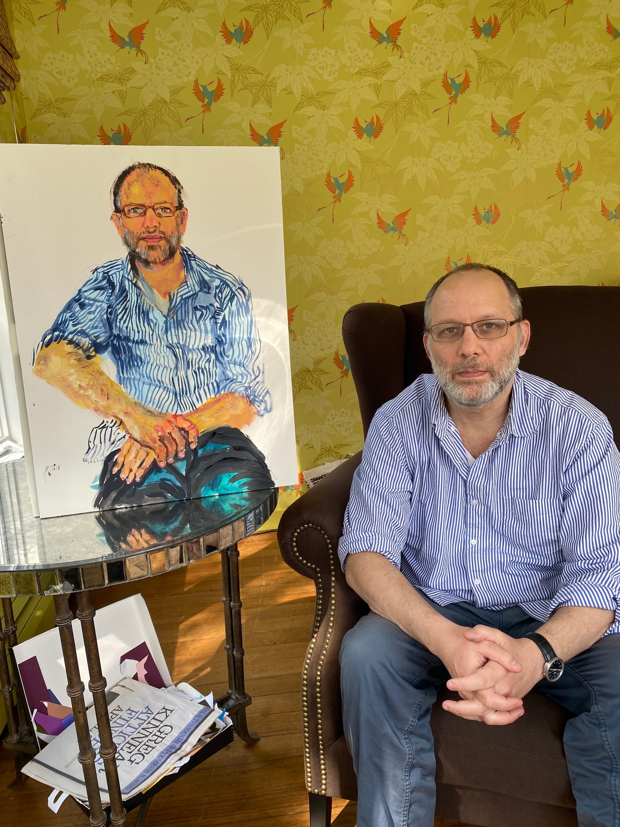 I plan to work on a series of Queer Family Portraits. These portraits will help redefine the idea of what a family is and looks like. Differently than the previous series, these paintings will be based on photos that I will take in the homes of queer families. These works will record the individuals and the details of their personal space and home. This project will include portraits of my queer friends who are raising children, as well as of my own family — myself, my husband, our 7-year-old boy/girl twins [Felix and Viva], and their mother. People often remark that our family is “so unique” in its structure. I find that an alienating response, in which queer families are still seen as foreign or other. These paintings will be a record of difference, yes, but also of familiarity and commonality. Collectively, the series will also serve as counter narratives to the historic and traditional place of family portraiture within the canon, creating contemporary alternatives that reflect both my own personal family experience — as a gay man with children — and those of my larger community. I intend to capture the likenesses of the family members as well as the intimacy between them while creating paintings that resonate with gestures, texture, color, and light.