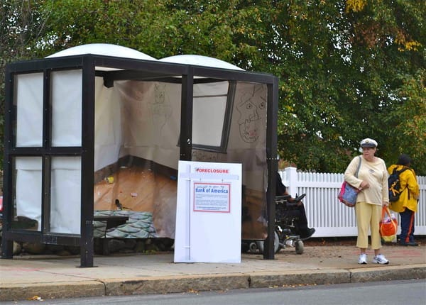 Discontent is stirring in New England's biggest city, and today a rally called Take Back Boston began. In preparation for the big event, local activists have outfitted 13 bus shelters with images that make them resemble foreclosed homes.