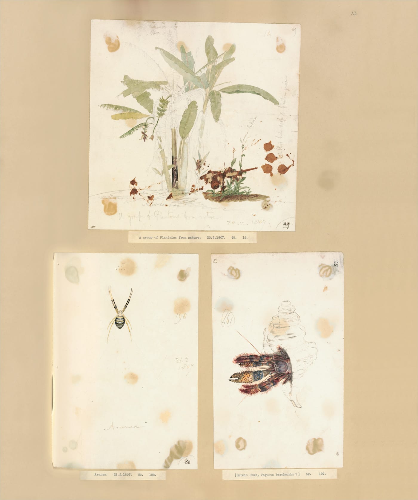 “Before the late 18th century sketchbooks were generally bespoke items, but artists have also made their marks on writing pads, account books, field notebooks, school exercise books, vellum, loose sheets of paper, sometimes pasted or bound into albums, partly worked manuscripts, letters, herbarium sheets and as marginalia,” write the Bynums in an introduction. “Carl Linnaeus drew on the back of an envelope and Mark Catesby on a playing card — reminders that for each carefully prepared session, people also improvised and used whatever was available.”