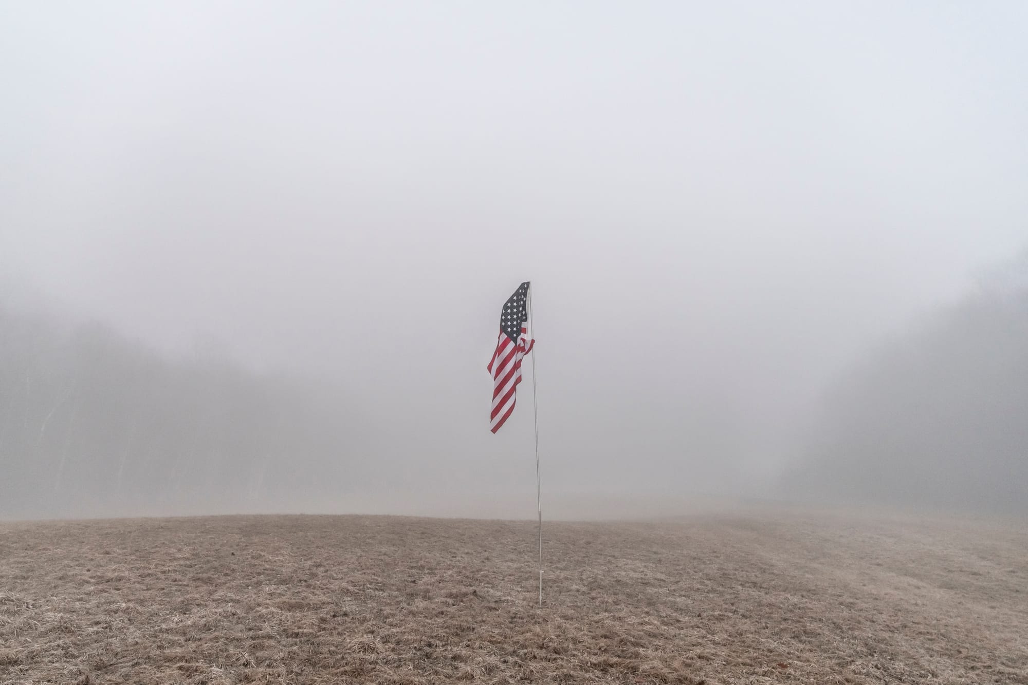 Blanco continues his quest for universal empathy in Boundaries with “Declaration of Interdependence,” a prose poem composed around phrases from the Declaration of Independence. For the phrase, “In every stage of these oppressions we have petitioned for redress…,” the poet conjures images of a farmer and his son collapsed on a couch and a black teenager “who drove too fast or too slow, talked too much or too little, moved too/quickly, but not quick enough.” Hessler’s accompanying photograph shows a partially unfurled American flag on a thin silver pole erected in the middle of a desolate, foggy field. This symbol of patriotism is at once vulnerable and gallant.