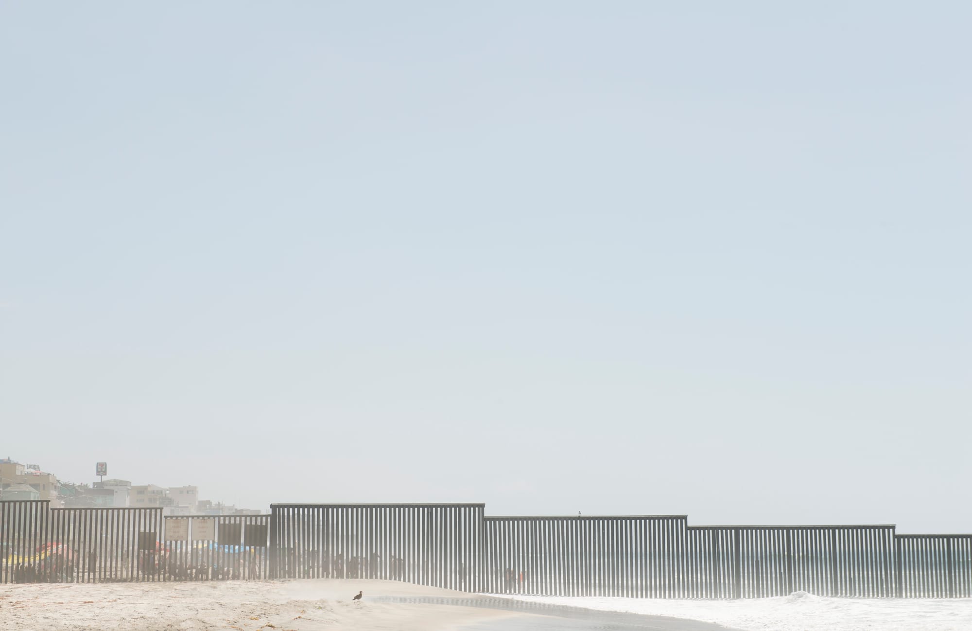 The section of coastal fencing in Hessler’s photograph “Border Wall, Between San Diego County and Tijuana” can be seen through, like vertical louvers. It divides a patch of sand and enters the ocean to the right, creating the sense that it might continue across the water. You can make out a 7-Eleven sign in the distance, evidence that America doesn’t stop at this boundary. One imagines that the wall builders envision the United States as one big gated community.