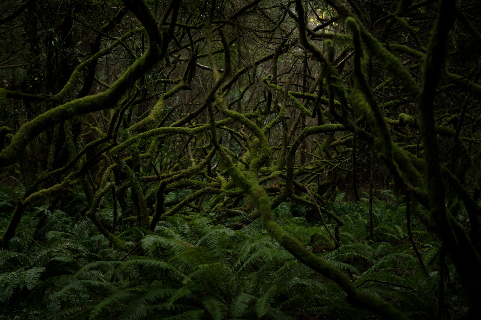 A major exception to Hessler’s expansive compositions is “Temperate Rainforest, Northern California,” a mesmerizing image of an impenetrable tangle of mossy tree limbs, twisting up from a bed of ferns. The photographer Eliot Porter would have loved it for its verdant greens.