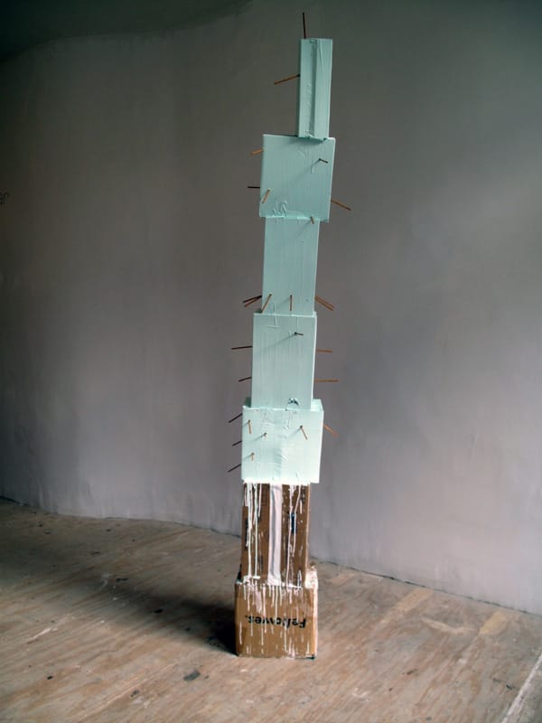 Walking past Open Source Gallery’s temporary space on Franklin Street I saw several anthropomorphic boxes lined against the walls, their hyper-simplicity too charming to dismiss. I walked inside where, as fortune would have it, artist Raphaela Riepl was manning the show, titled Adorable Steamed Sea Urchin. We spent some time discussing her work and creative process, and then I explored the exhibition’s crew of energetic sculptures.