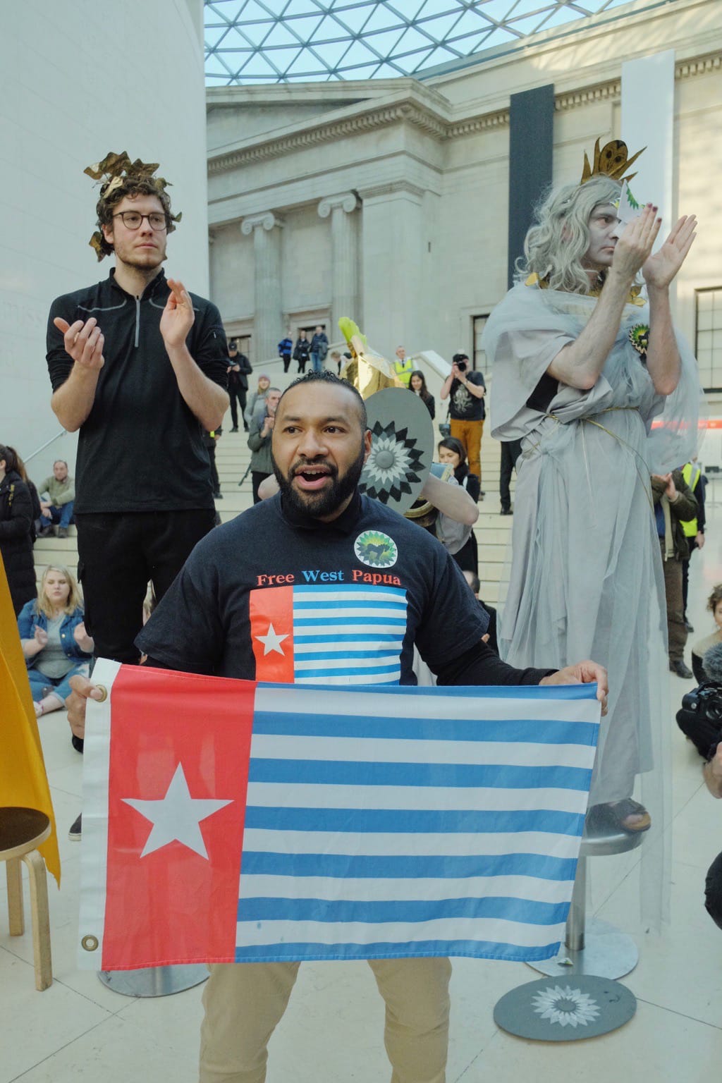 Saturday’s mass action — described by BP or not BP? as a “creative takeover” — took place across the museum and featured performances, spoken word, sing-alongs and talks by campaigners from West Papua and Senegal. Protestors dressed as Trojan statues greeted visitors to the museum in the sunny courtyard, handing out leaflets with a timetable of events. Origami swans were scattered throughout the museum adorned with messages such as: “Choose sponsors who care about our future.” BP or not BP? estimated that 1,500 people participated in the protest.