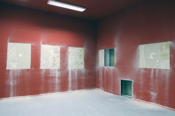 From the photographs of the installation, Downey’s latest work looks like the ruins of some contemporary ruin with shades of Pompeii, the spots of the walls where art was painted for the 2003 show are carved out and only one wall is left untouched because, the artist says, photos were hanging there and they left no mark.