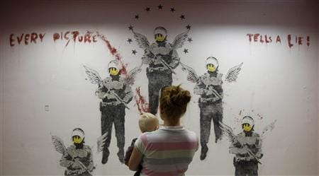 Over two weeks ago, a story about an excavated Banksy in Berlin ricocheted across the global media. Most of the coverage featured closely cropped smiley faced riot police and the name “Banksy” screamed in the media headlines. From the tone of the coverage and the emphasis on the discovery of a lost Banksy most people probably assumed it was another case of an opportunist commercial gallery swiping a street art work and displaying it in order to make a potential profit. What many people — and news outlets — didn’t realize was that the glimpse of Banksy’s “Every Picture Tells a Lie!” (2003) was only part of a much larger work by artist Brad Downey. The photo by Reuters photographer Tobias Schwarz that was beamed around the world erased Downey from the frame and positioned a woman with baby front and center, as if to anesthetize any political bite that Banksy’s work featuring a triangle of riot police and bloody letters might have.