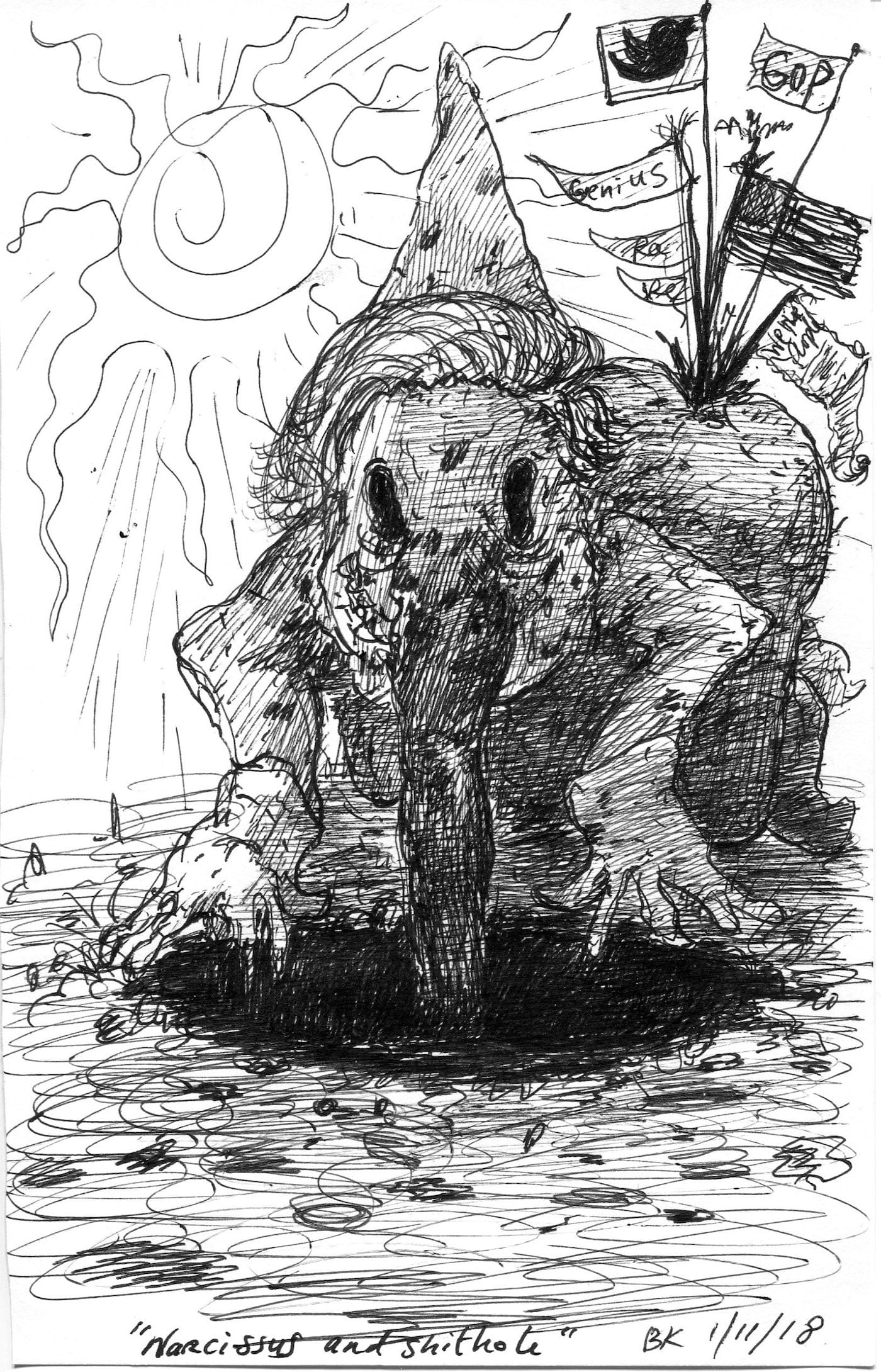Sucking at the shithole, an unquenchable leach. Caravaggio’s pond rendered black hole: no love to reflect, only shitdrug epidemic nourishment for King Narcissisus. Sucking up the shit flushed away by culture, sucking out the clean air. Welcome to Shitsville, USA! Feed! Feed! The raging grand shitwizard! Sucking up your bottom feeder crony shitnibblets! Suck! Suck! Your true reflection is our collective dump now boiling over.
