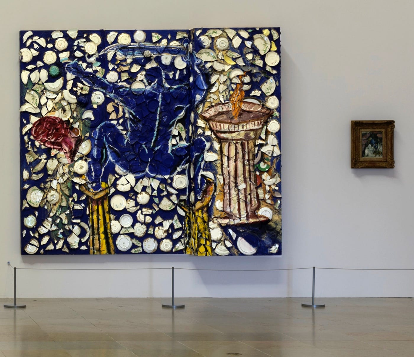The show starts with some of Schnabel’s earliest works, including the large-scale signature plate painting “Blue Nude with Sword” (1979) (painted on broken crockery) that he hung next to Cézanne’s much smaller and much better painting “The Strangled Woman” (1876). This painting by Cézanne greatly impressed me when I saw it in the Sade: Attacking the Sun show, also at Musée d’Orsay a few years ago. Besides a somewhat similar palette, these two very different depictions of aggressive male behavior have little to do with each other and Schnabel’s piece ends up looking exceedingly crude next to Cézanne’s. On the other hand, I would certainly have enjoyed seeing “Blue Nude with Sword” hung in the Park Güell in Barcelona, since it was somewhat inspired by Antoni Gaudí’s marvelous mosaic work.